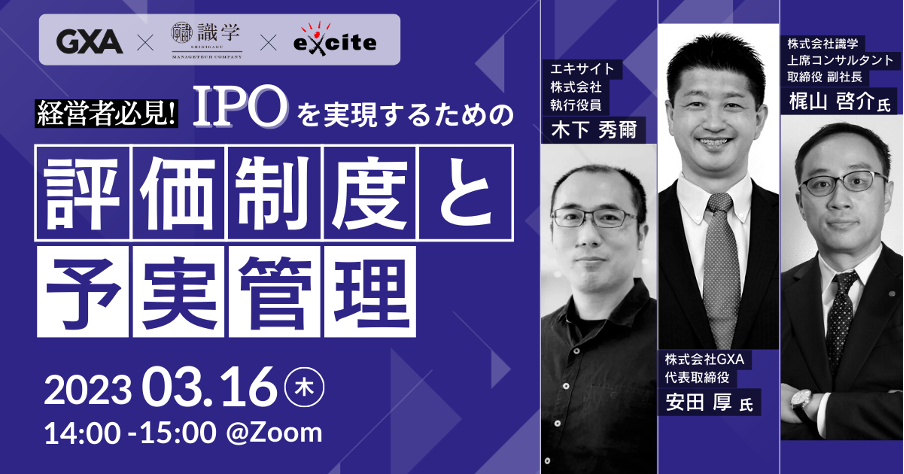 エキサイト株式会社(所在地:東京都港区、代表取締役社長:西條 晋一)は、株式会社GXA、株式会社識学の3社共同で、2023年3月16日(木)14:00より「IPOを実現させるために成長企業が取り組む、評価制度と予実管理」をテーマに参加費無料のセミナーを開催します。