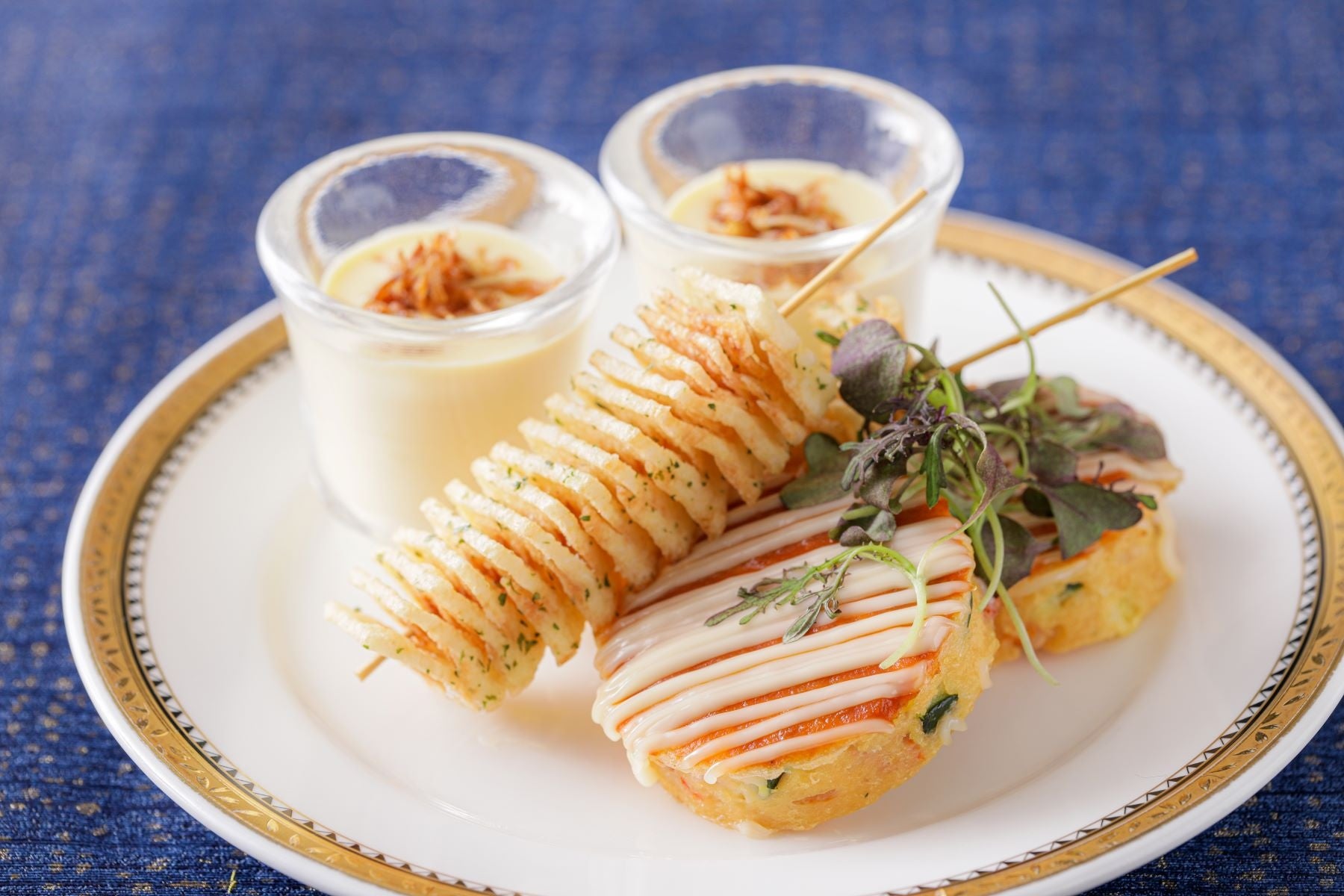 (中段)スパイラルポテト/フレンチ風お好み焼き アメリケーヌソース/冷製コーンスープ