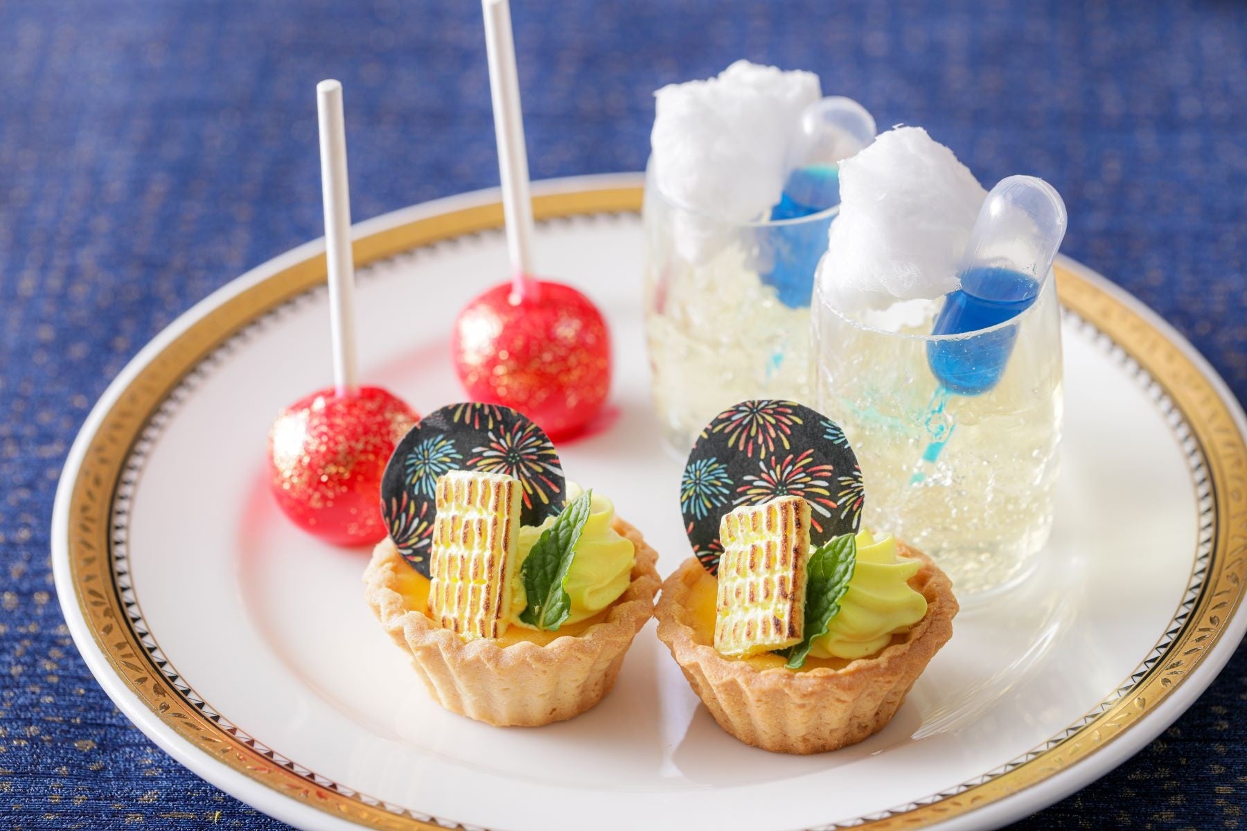 3段スタンドは、日本の夏の風物詩 “お祭り”の華やかと楽しさを詰め込み、“りんご飴”や“かき氷” を模した遊び心あふれるスイーツを。そして、縁日屋台からインスパイアされたセイボリーは、お祭りのわくわく感を演出。