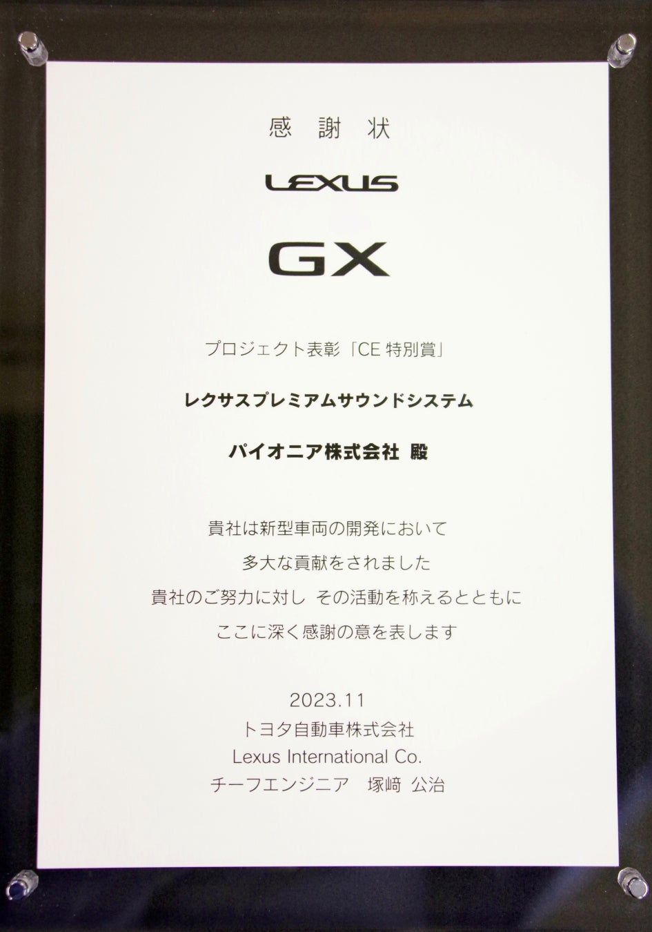 パイオニアのプレミアムサウンドシステムが、LEXUSの新型「GX」(2024年国内発売予定)の標準装着システムに採用されました。また当社は、優れた技術により同車両の商品力向上に貢献したサプライヤーとして「LEXUS GXプロジェクト表彰 CE※1特別賞」を受賞しました。