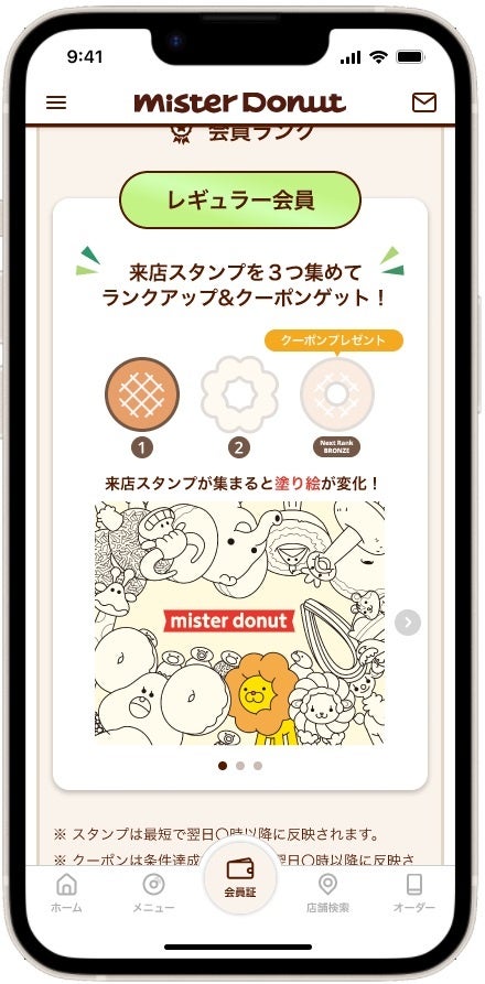 ミスタードーナツをよりお楽しみいただけるように来店毎にスタンプを貯められる機能や、来店回数に応じた会員ランク制度を新たに導入します。