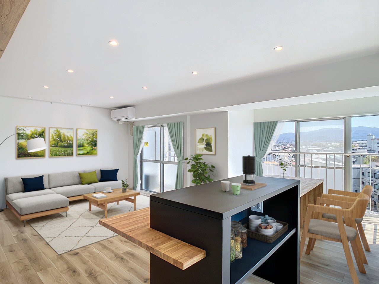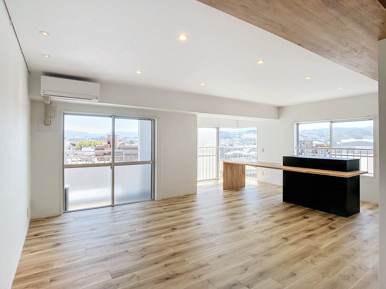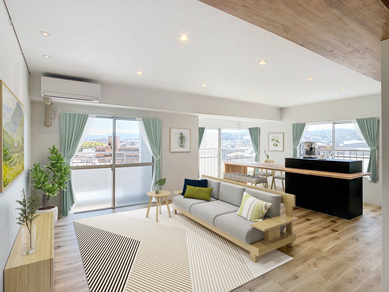 さらに、このおしゃれな賃貸リノベーション空間の窓からは山手の自然豊かな景観を一望でき、外の風景と一体感を感じながら過ごすことができます。内装にはその景観との調和を考え、ナチュラルな木目調の床材を採用し、クロスや天井材もシンプルでニュートラルなトーンを選定。まるでデザイナーズ リノベーション賃貸のような、自然光と内装が溶け合うような空間に仕上げています。