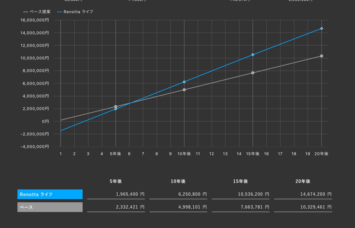 投資効果を検証するために、通常の原状回復工事を行った場合の税引後キャッシュフローと、今回のリノベーションを行った場合の税引後キャッシュフローを比較するシミュレーションを行なった結果、約6年で収益が逆転し、10年後には約125万円の差益が見込まれる結果となっています。