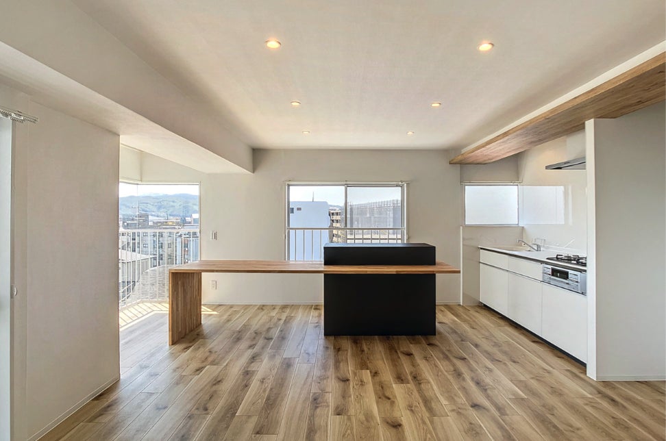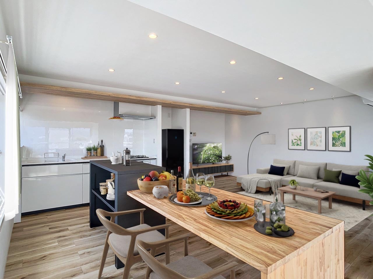 本プロジェクト最大の特徴は、19.5帖の開放的なLDKに配置された、アイランドスタイルのダイニングテーブルが付いた賃貸の魅力が詰まった大きなアイランド型のキッチンカウンター。料理を楽しみながら自然に会話が生まれ、時には仲間とテーブル(キッチンカウンター)を囲み、時には家族との特別な時間を分かち合う。このこだわりのダイニングキッチンが、日常の「場づくり」の中心になる新しい発想です。