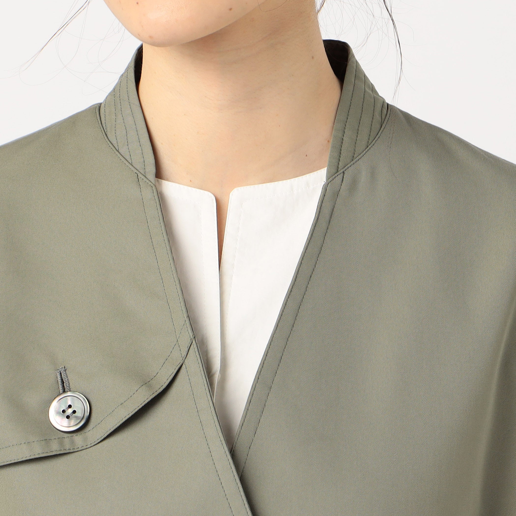 ・首元がすっきりと見えるようにノーカラーのデザインです。