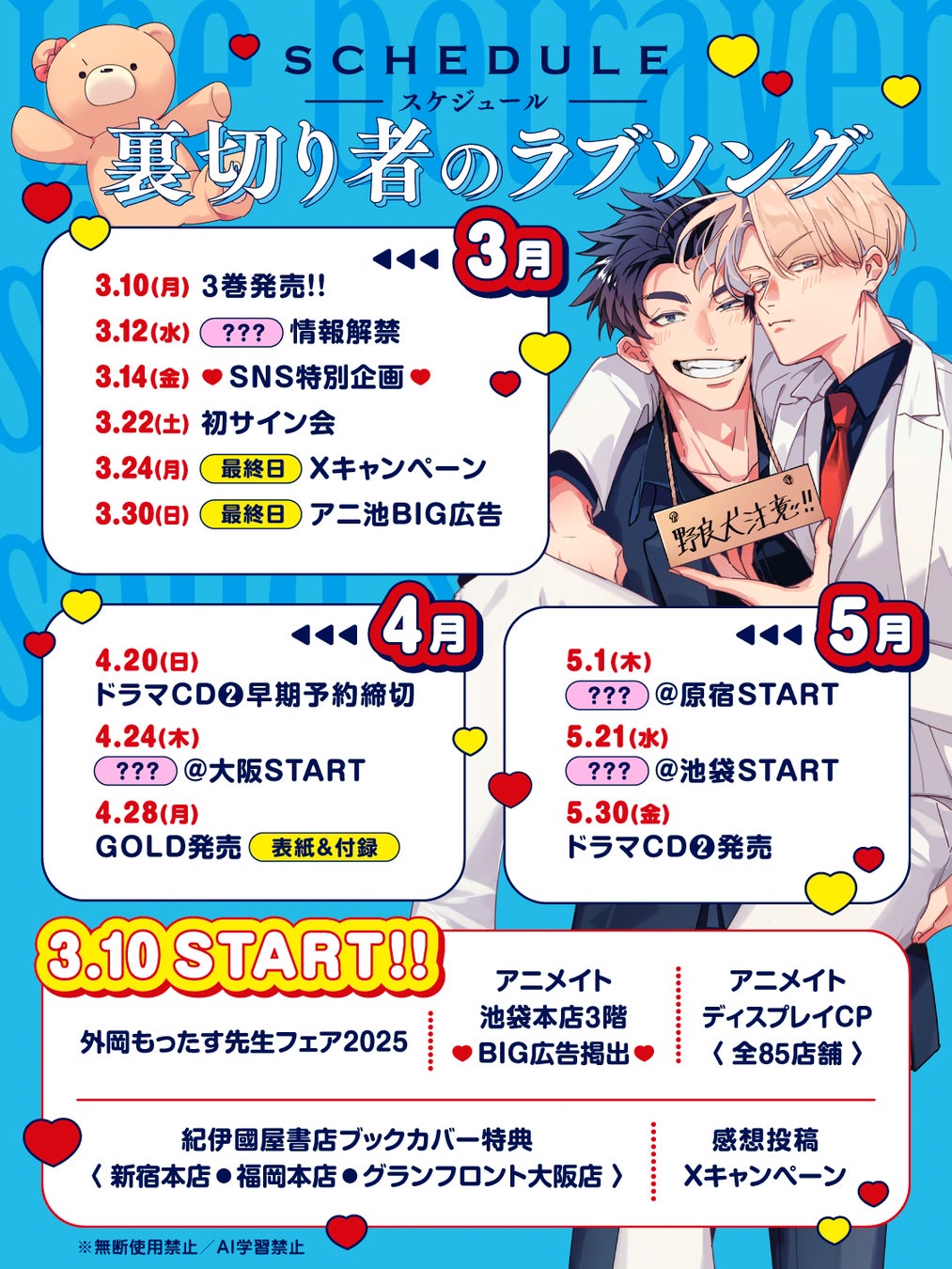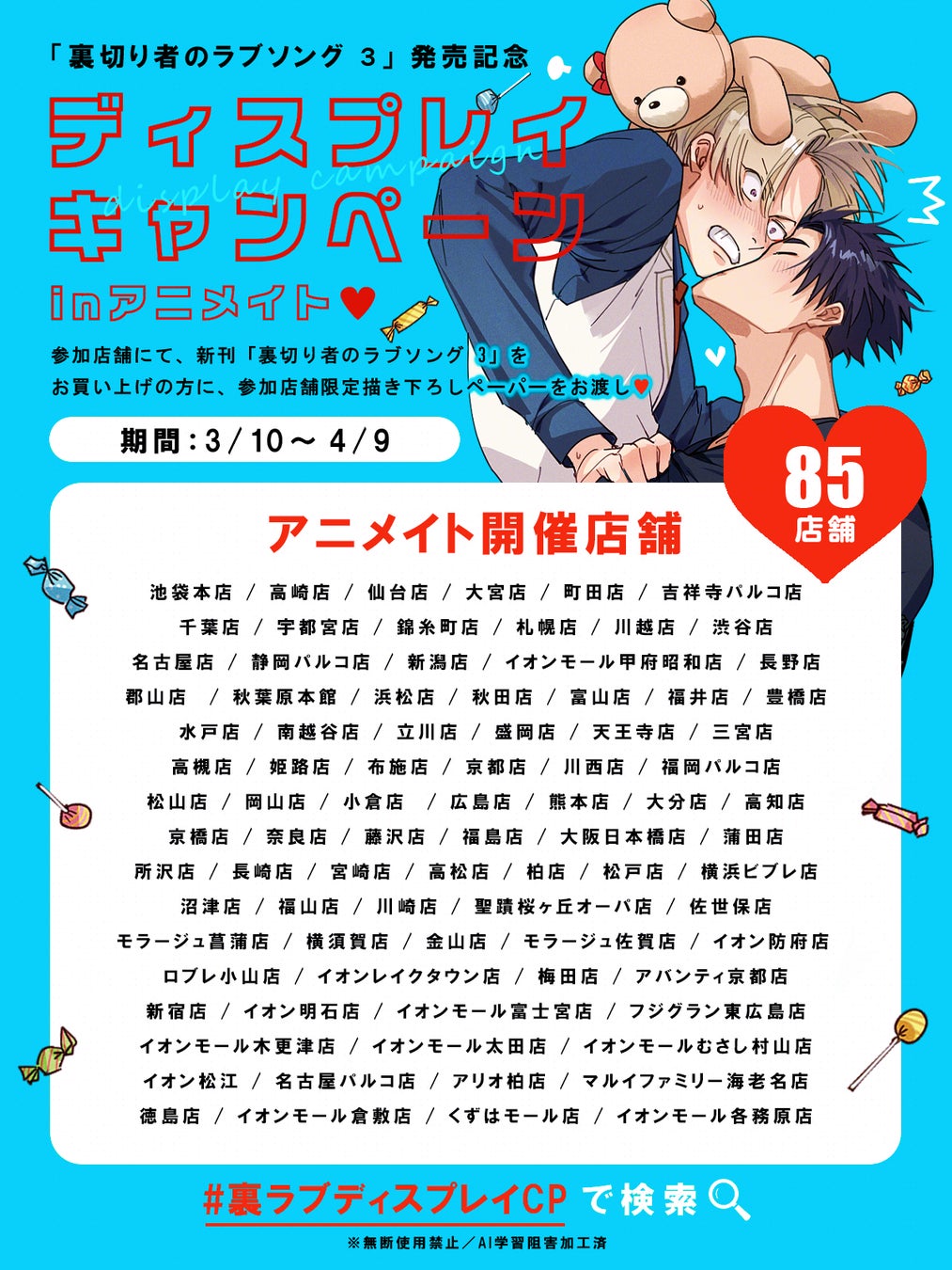 ただいまアニメイト池袋本店3Fのビジュアルパネルが「裏切り者のラブソング」仕様になっております! お近くにお立ち寄りの際は是非ご覧ください。