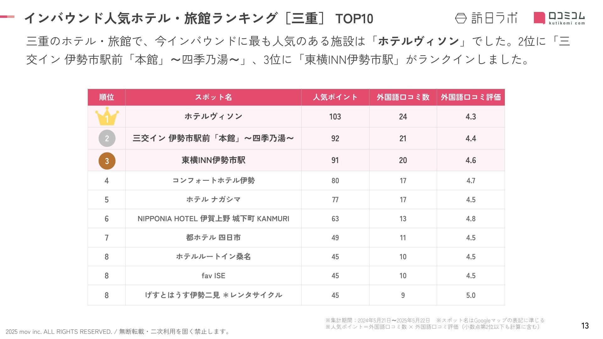 業界最大級のインバウンドビジネスメディア「訪日ラボ」及び 店舗向け集客一元化プラットフォーム「口コミコム」を運営する株式会社mov(代表取締役:渡邊 誠、本社:東京都渋谷区、以下mov)は、三重県のホテル・旅館に寄せられた最新の口コミデータから、独自の『インバウンド人気ホテル・旅館ランキング』を発表しました。