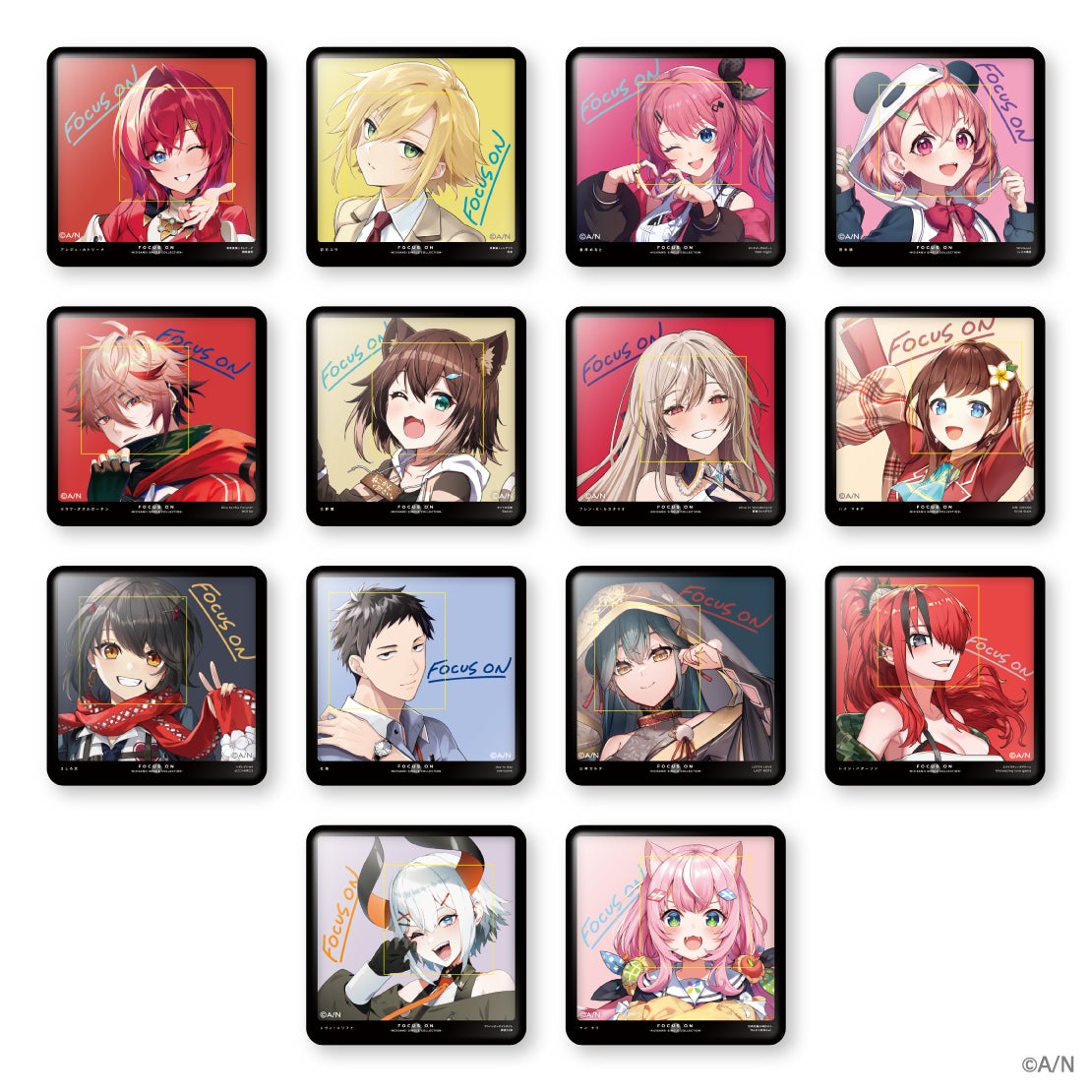 ・種類:全14種(周央サンゴ、長尾景、花畑チャイカ、早瀬走、壱百満天原サロメ、伏見ガク、フミ、先斗寧、本間ひまわり、魔界ノりりむ、夕陽リリ、リゼ・ヘルエスタ、レオス・ヴィンセント、ローレン・イロアス)