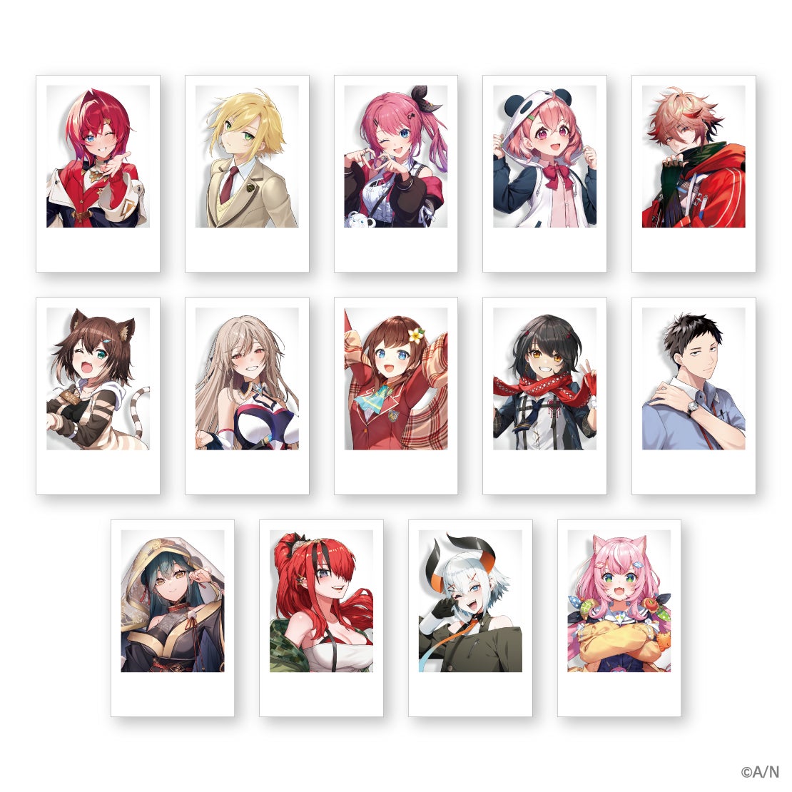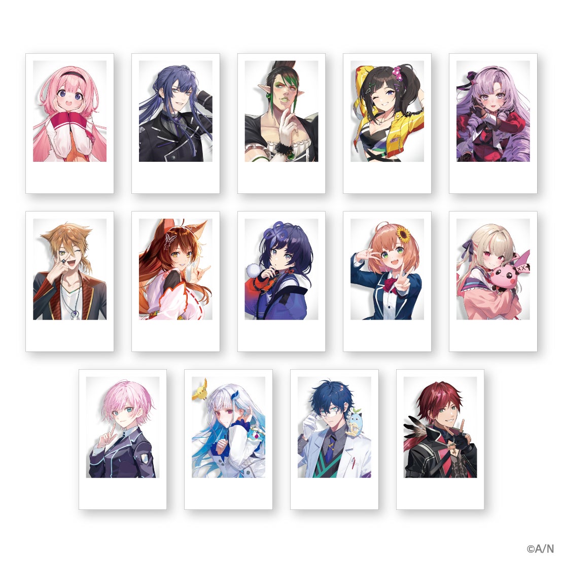 ・種類:全14種(アンジュ・カトリーナ、卯月コウ、倉持めると、笹木咲、セラフ・ダズルガーデン、文野環、フレン・E・ルスタリオ、ハナ マキア、ましろ爻、社築、山神カルタ、レイン・パターソン、レヴィ・エリファ、ヤン ナリ)