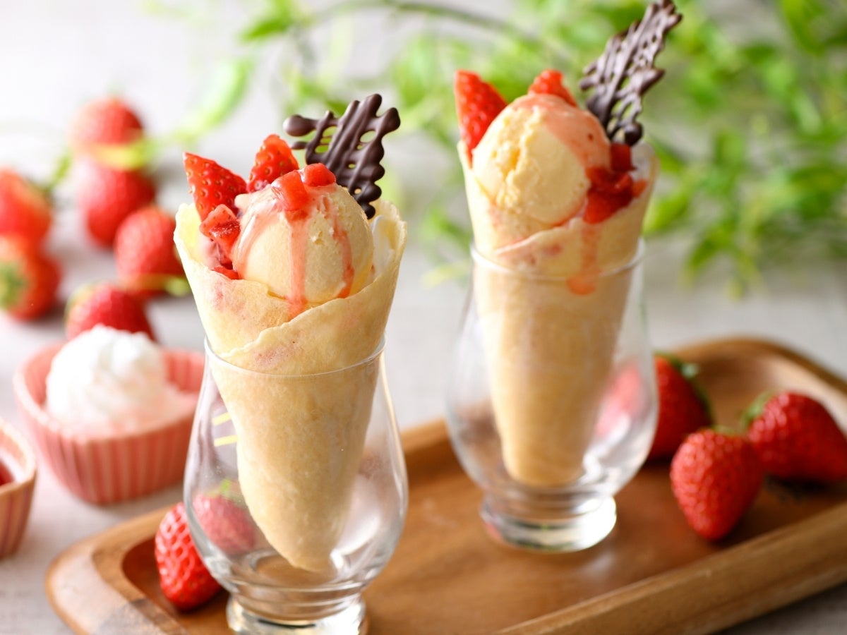 みんな大好き♪甘酸っぱいフレッシュいちごに、バニラアイスとホイップ、イチゴソースが絶妙のバランス!