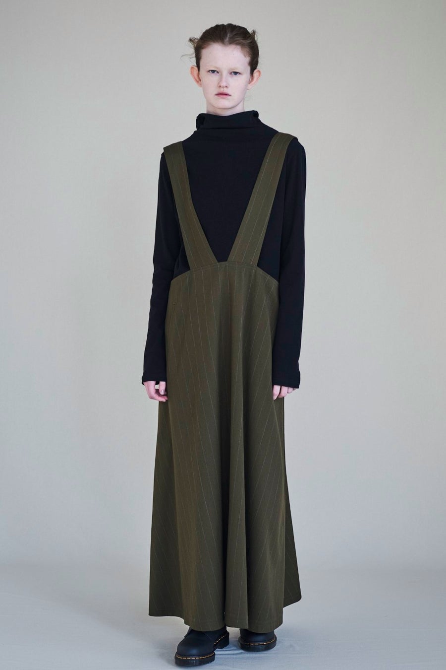 チョークストライプ柄のロングフレア吊りドレス。モダンなシルエットでY’sらしさを演出。適度なハリ感のある生地を使用しており、美しい立体的なフレアラインで軽やかさを加えた。1枚で着映えしながら、インナーとのレイヤードも楽しめるアイテム。