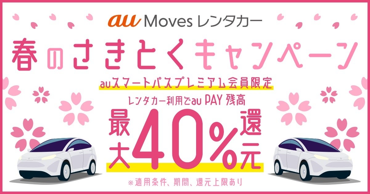 au Moves レンタカーでは、2023年3月1日から2023年4月9日の期間中レンタカーをご利用いただいたお客さまを対象に、利用額の最大30%をau PAY 残高として還元する「au Moves レンタカー 春のさきとくキャンペーン」を開催します。また、auスマートパスプレミアム会員のお客さまには還元率をさらに10%上乗せし、利用額の最大40%をau PAY 残高として還元します。予約受付は2023年2月8日から開始します。