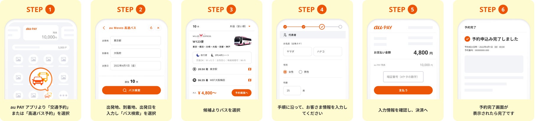 高速バスの検索・予約・決済・予約照会・キャンセル登録などの一連のお手続きをau PAY アプリ上で完結することが可能です。auに限らずスマートフォン・タブレットをお持ちのすべての方にご利用いただけます。決済方法は、au PAY(ネット支払い)となります。