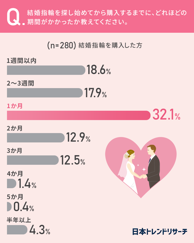質問2:結婚指輪を探し始めてから購入するまでに、どれほどの期間がかかったか教えてください。