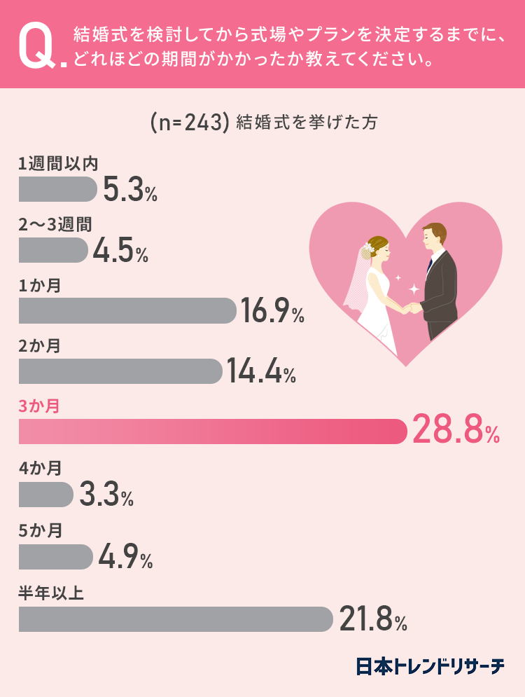 結婚式を検討してから式場やプランを決定するまでに、どれほどの期間がかかったか聞いてみたところ、結果は以下の通りでした。