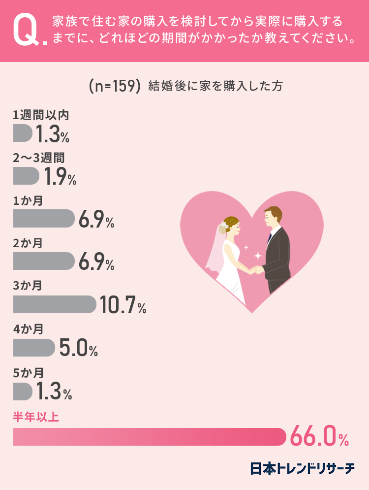 結婚指輪は「1か月」、結婚式場やプランなどは「3か月」、そして家の購入は「半年以上」が検討期間としてもっとも多い結果となりました。
