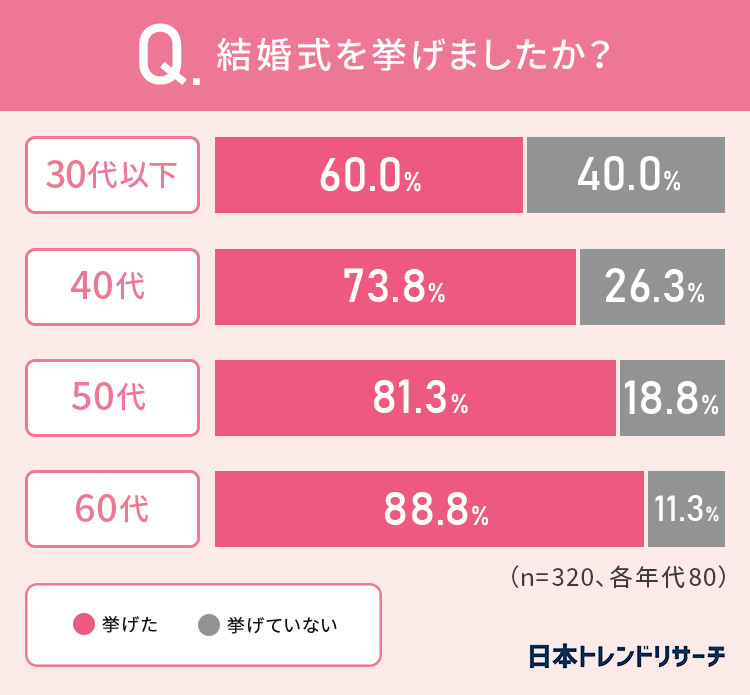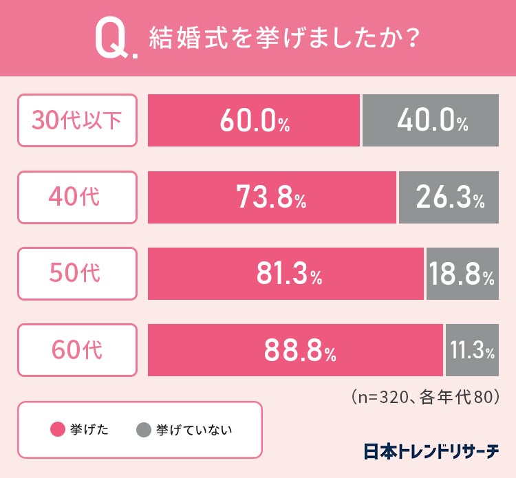 各年代を平均して、およそ75.9%の方が「結婚式を挙げた」と回答していますが、年代が下がるほど結婚式を挙げていない方の割合が増えるようです。