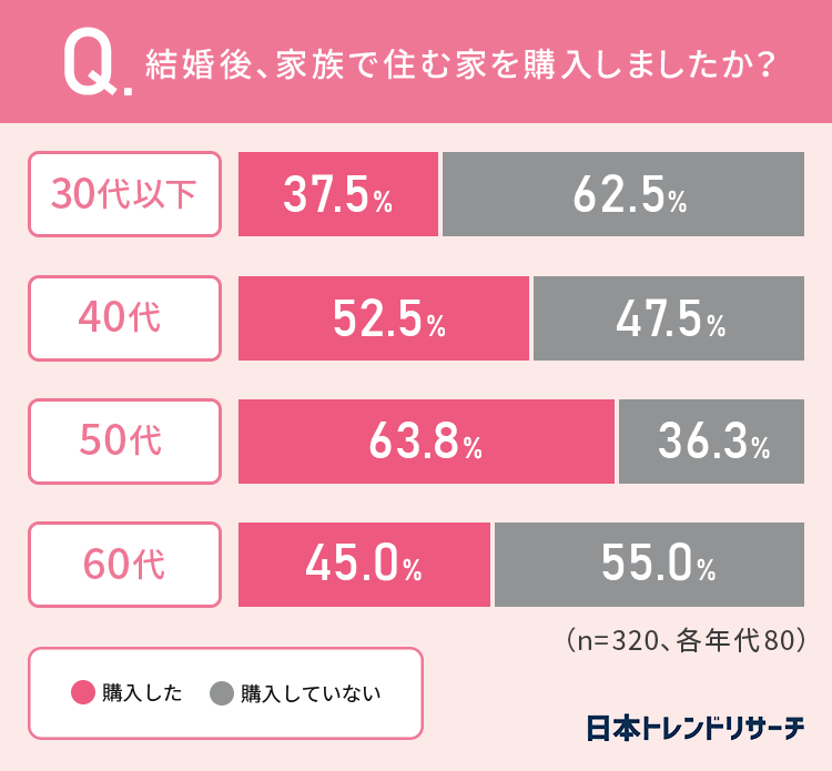 平均するとおよそ5割の方が「結婚後に家族で住む家を購入した」と回答しています。