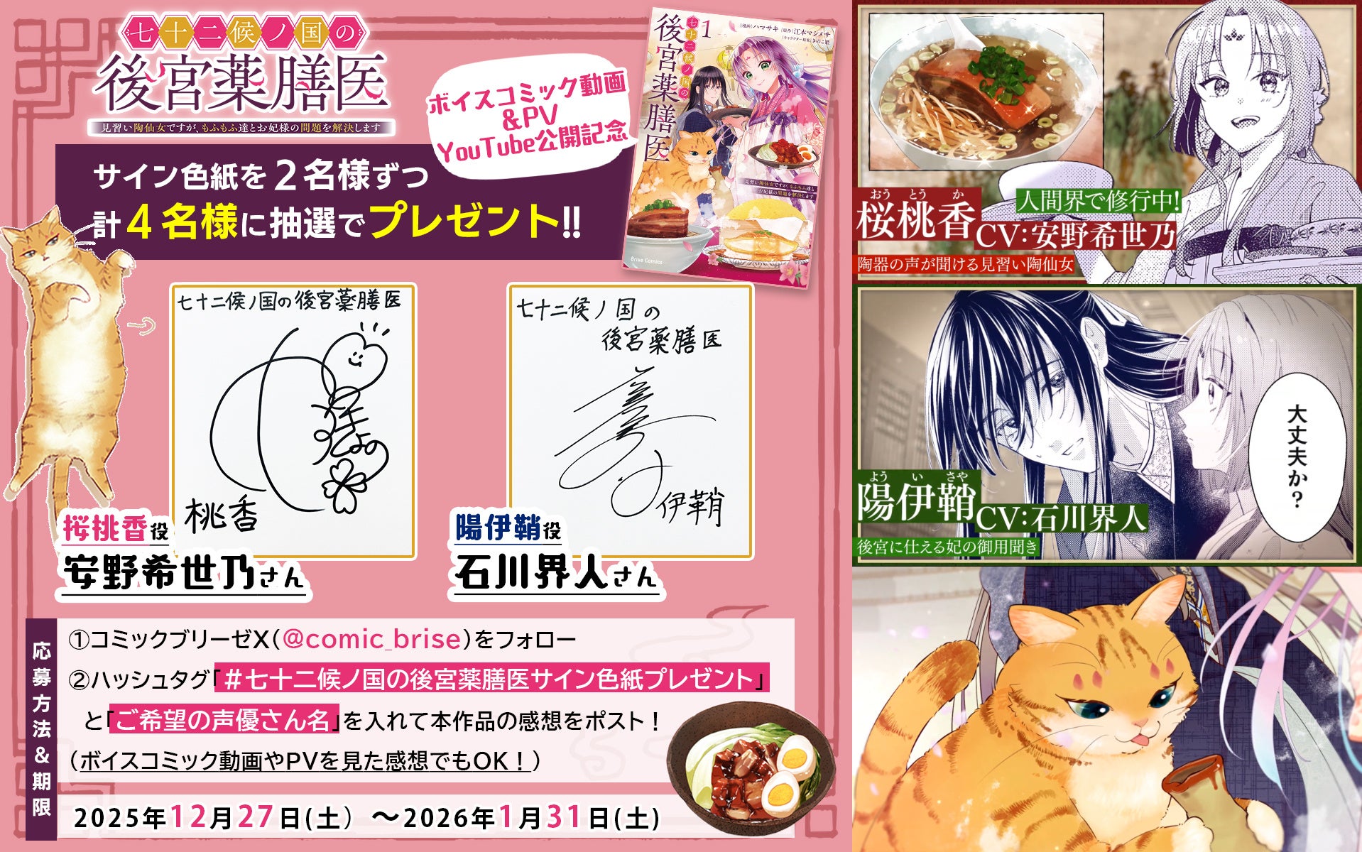 新PV公開【CV:安野希世乃/石川界人】美味しいグルメで後宮の闇を解決!?『七十二候ノ国の後宮薬膳医 ~見習い陶仙女ですが、もふもふ達とお妃様の問題を解決します~』最新第5話も公開!
