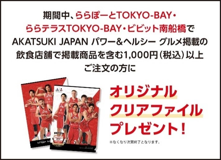 ららぽーとTOKYO-BAY、ららテラスTOKYO-BAY、ビビット南船橋でAKATSUKI JAPANパワー&ヘルシー グルメ掲載の飲食店舗で掲載商品を含む1,000円(税込)以上ご注文の方にオリジナルクリアファイルをプレゼント。