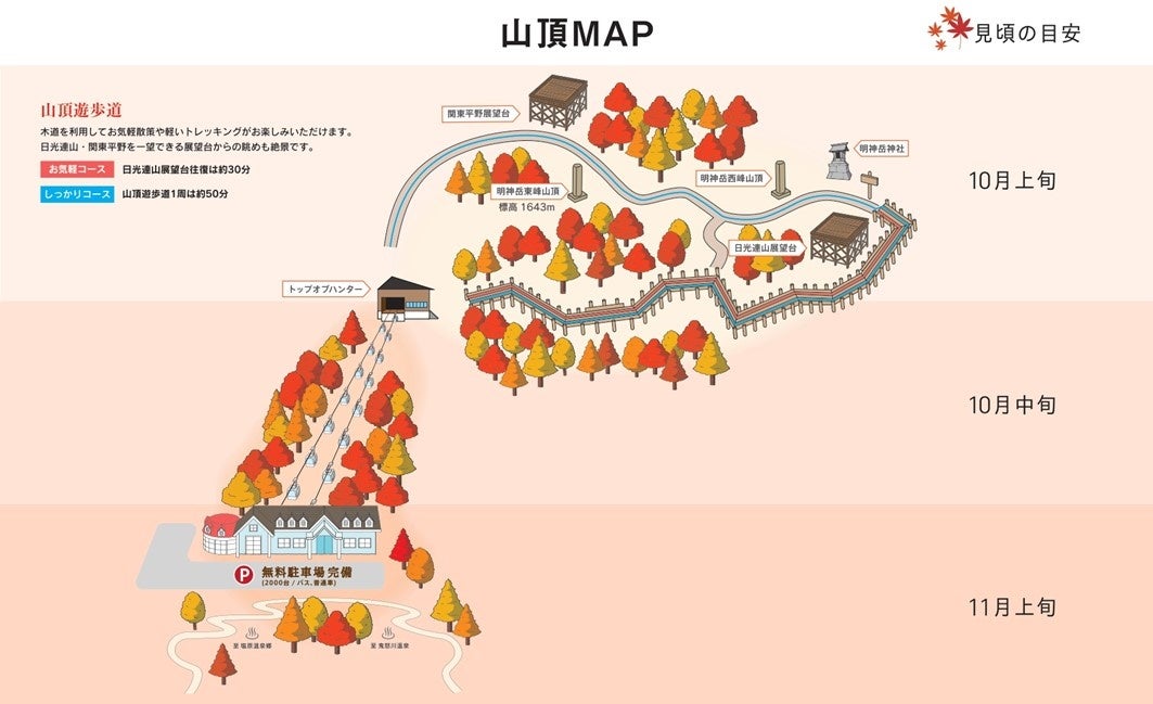 ハンターマウンテン塩原は、日光鬼怒川温泉と塩原温泉を結ぶ「日塩もみじライン」のほぼ中間に位置し、例年 10 月上旬に山頂から始まる紅葉が徐々に山麓へと移りゆく絶好のタイミングでゴンドラ運行をスタート。全長 2,400 m、乗車時間約 10 分で標高 1,643 mの山頂に到達し、モミジ、カエデ、ブナ、シラカバ、カラマツなど広葉樹から針葉樹に至る多彩な樹種が織りなす紅葉のパノラマを一望できます。山頂には一周約 50 分のトレッキングコースやウッドデッキの遊歩道、2 か所の展望台を設置。日光連山や関東平野を望む雄大な眺望を楽しめます。さらにドッグランを完備し、大人も子どももペットも一緒に快適に過ごせる環境を整備。紅葉の名所、ハンターマウンテン塩原で心に残る秋のひとときをぜひお楽しみください。