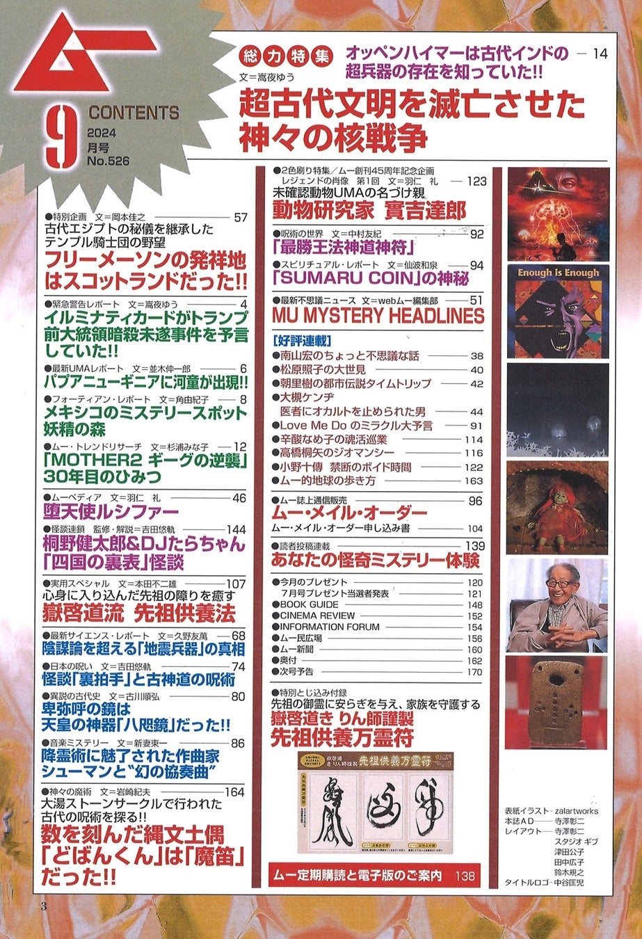 2色刷り特集 動物研究家 實吉達郎/実用スペシャル 嶽啓道流 先祖供養法/特別とじ込み付録 嶽啓道き りん師謹製 先祖供養万霊符/陰謀論を超える「地震兵器」の真相/数を刻んだ縄文土偶「どばんくん」は「魔笛」だった‼/怪談「裏拍手」と古神道の呪術/イルミナティカードがトランプ前大統領暗殺未遂事件を予言していた‼/パプアニューギニアに河童が出現‼/ほか
