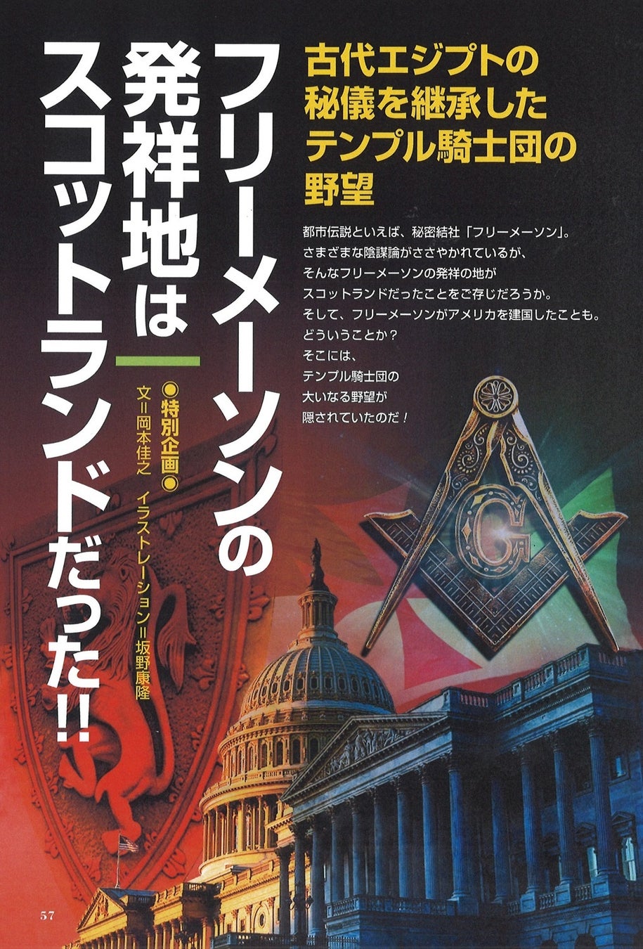 陰謀論系都市伝説といえば、今や定番の秘密結社フリーメーソンである。これまで、さまざまな噂がささやかれてきたが、その発祥地がイギリスは、スコットランドにあったことは、あまり知られていない。彼らは、フリーメーソン国家として、アメリカ合衆国を建国した。その裏には、聖地エルサレムを守ったテンプル騎士団の大いなる野望が隠されていた‼