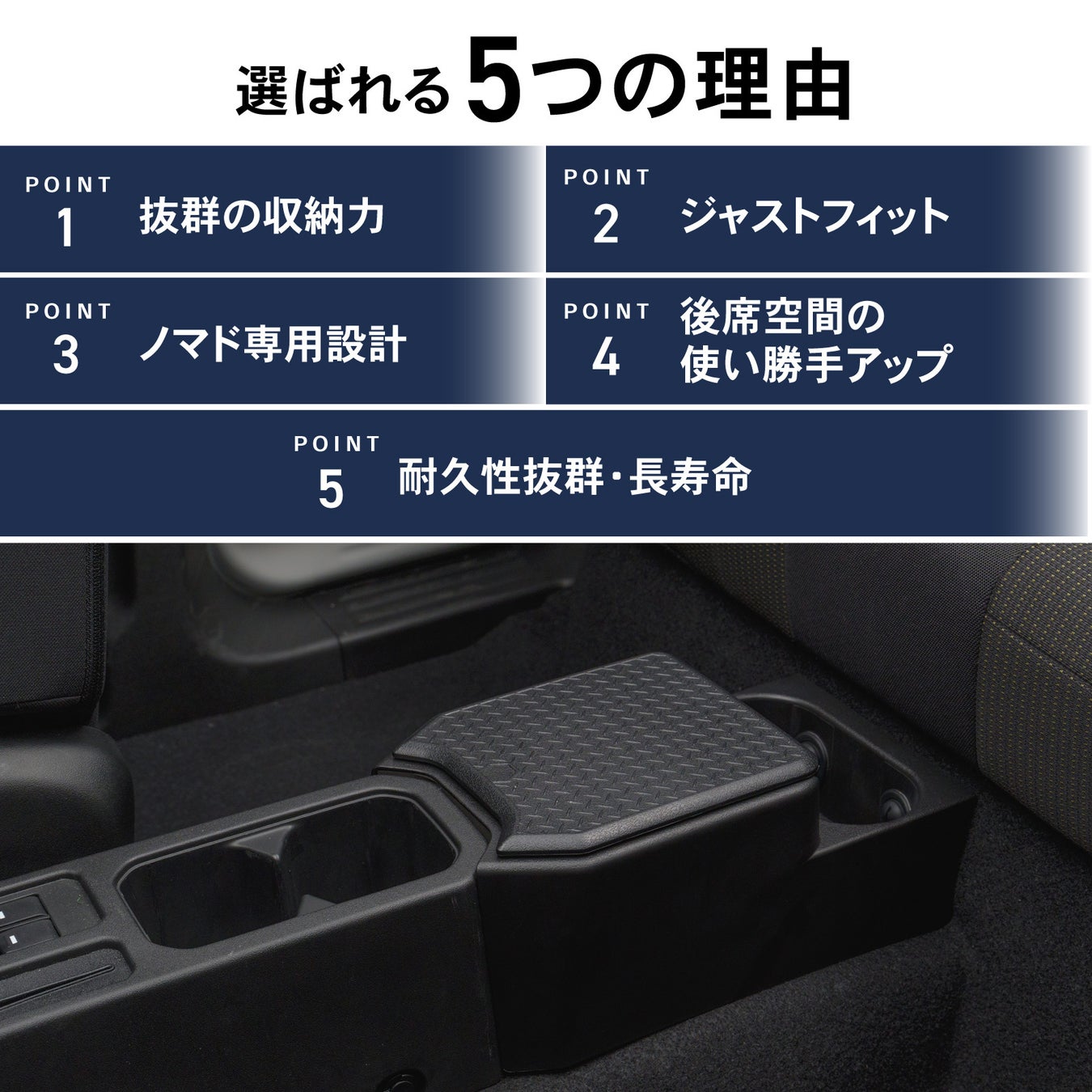 ジムニーノマド専用 リアコンソールボックス。収納ボックスは車内の散らかりを一瞬で解決。設置は2列目フロアの中央に置くだけ。丈夫で長持ちするABS素材を採用。車内に馴染むデザインで快適空間をお届け!