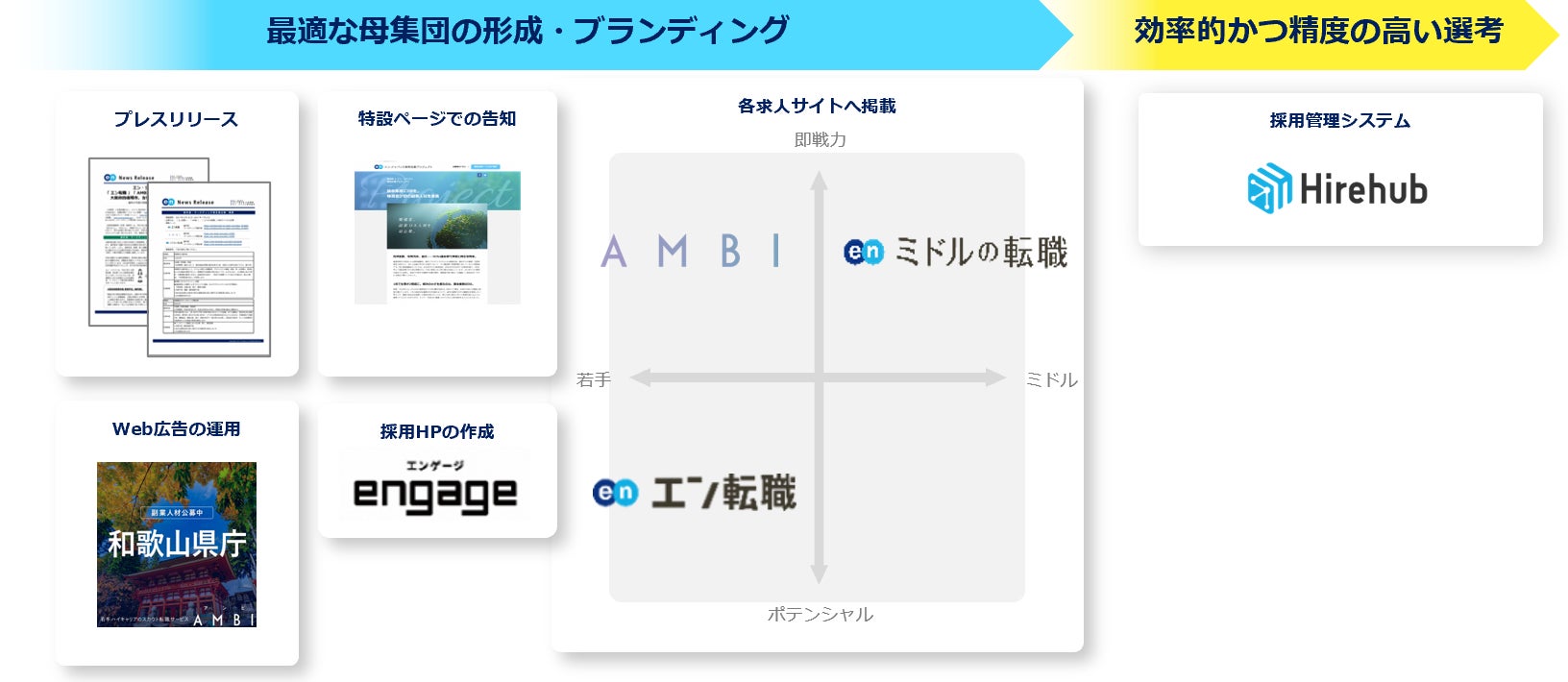 プレスリリースや特設ページ、『engage』を用いた採用HPの作成、Web広告での告知に加え、各求人サイトでの集客支援を実施。『エン転職』『AMBI』『ミドルの転職』とターゲットの異なる3つの求人サイトを活用することで、ターゲットへ網羅的に求人を届けました。また採用管理システム『Hirehub』の提供により、選考フローを支援。求職者と同社の適切なマッチングを実施しました。