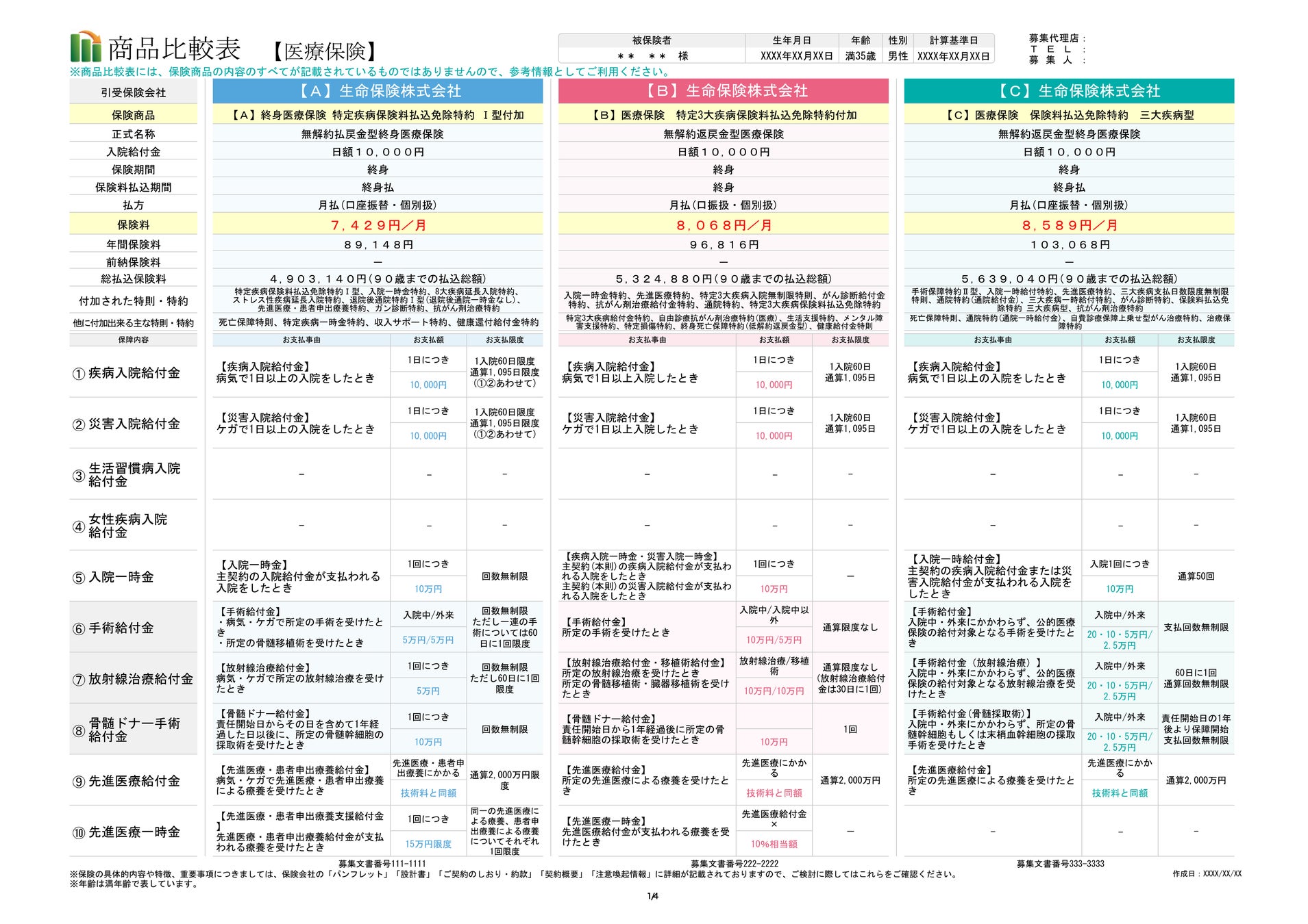 お客様のご希望をもとに保険商品を検索し、その中からさらにお客様のご希望に沿った複数の保険商品を同じフォーマットで並べた比較表をお出しします。別々の保険会社・保険商品で並べたり、同じ保険商品の中でも保障額や特約を変更して並べることもできます。ご希望に沿わない場合は条件を変更して何度でもお出しいたしますので、ご納得できるまで比較頂けます。