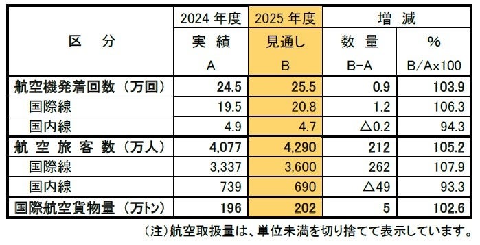 2025年度の航空取扱量見通しは、発着回数及び旅客数ともに2024年度を上回ると想定しております。国際線の発着回数及び旅客数は中国及び東南アジア路線を中心とする増便が見込まれることから、2024年度を上回ると想定しました。国内線の発着回数及び旅客数は、需要は底堅いものの、2024年度冬ダイヤにおいて生じた減便が通期化する影響から2024年度をやや下回るものと想定しました。