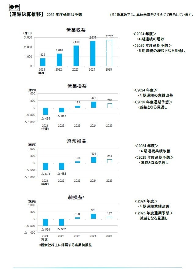 ▶鉄道事業 : 料金改定により線路使用料収入が増収となり、営業収益が2024年度から18億円増収の48億円、営業利益は2024年度から19億円増益の26億円となる見通しです。