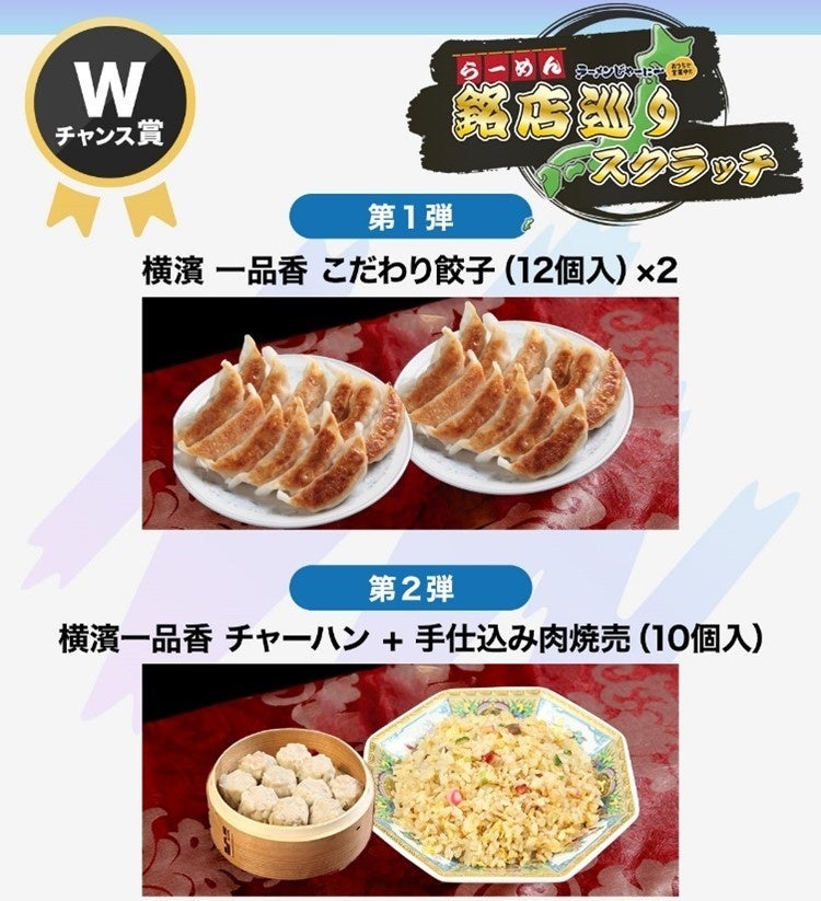 このたびDMMスクラッチで開始する『ラーメンじゃーにー銘店巡りスクラッチ』をご購入いただくと、『ラーメンじゃーにー』で人気の銘店ラーメンがランダムで当たります。さらに、スクラッチ1枚ご購入ごとに、横濱たんめん発祥の店として知られる「横濱 一品香」の餃子、チャーハン、焼売が当たるWチャンス賞も実施いたします。