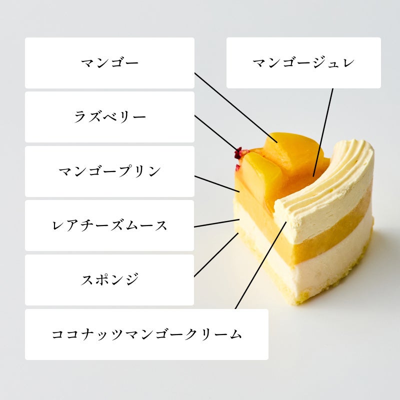 マンゴーの華やかな甘さと、爽やかな味わいのレアチーズムースが調和するケーキです。