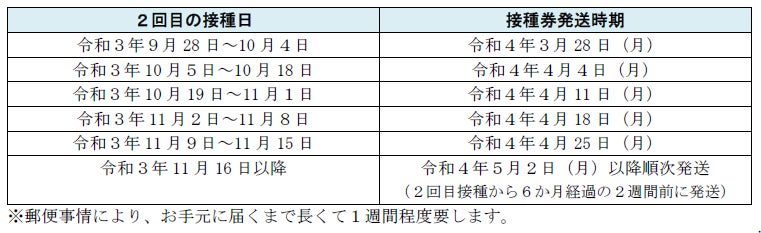これまで3回目接種券は2回目接種から6か月が経過する週に発送していましたが、速やかに予約ができるようさらなる前倒しを実施し、6か月経過の1~2週間前を目安に発送します。接 種券が届いたら予約ができますが、実際に3回目接種を受けられるのは、2回目接種から6か月以上経過した日になりますのでご注意ください。