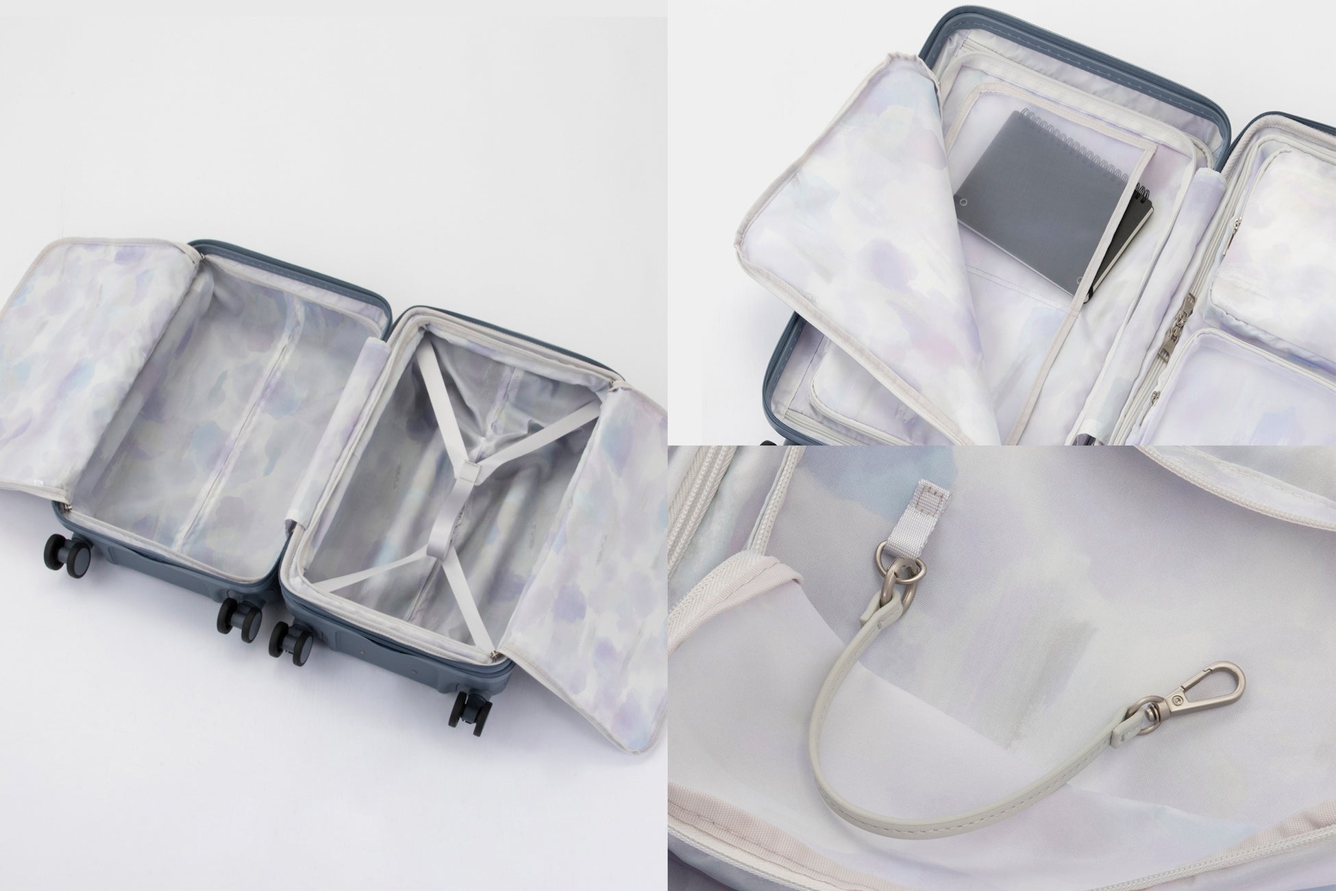 オリジナル柄を採用した内装には、ジャケットなど大きな衣類を分けて収納できるポケット「ドレスクローゼット」を配置。その他、小物収納に適したマチ付きポケットや、中身が見えるシースルーポケットを備えます。