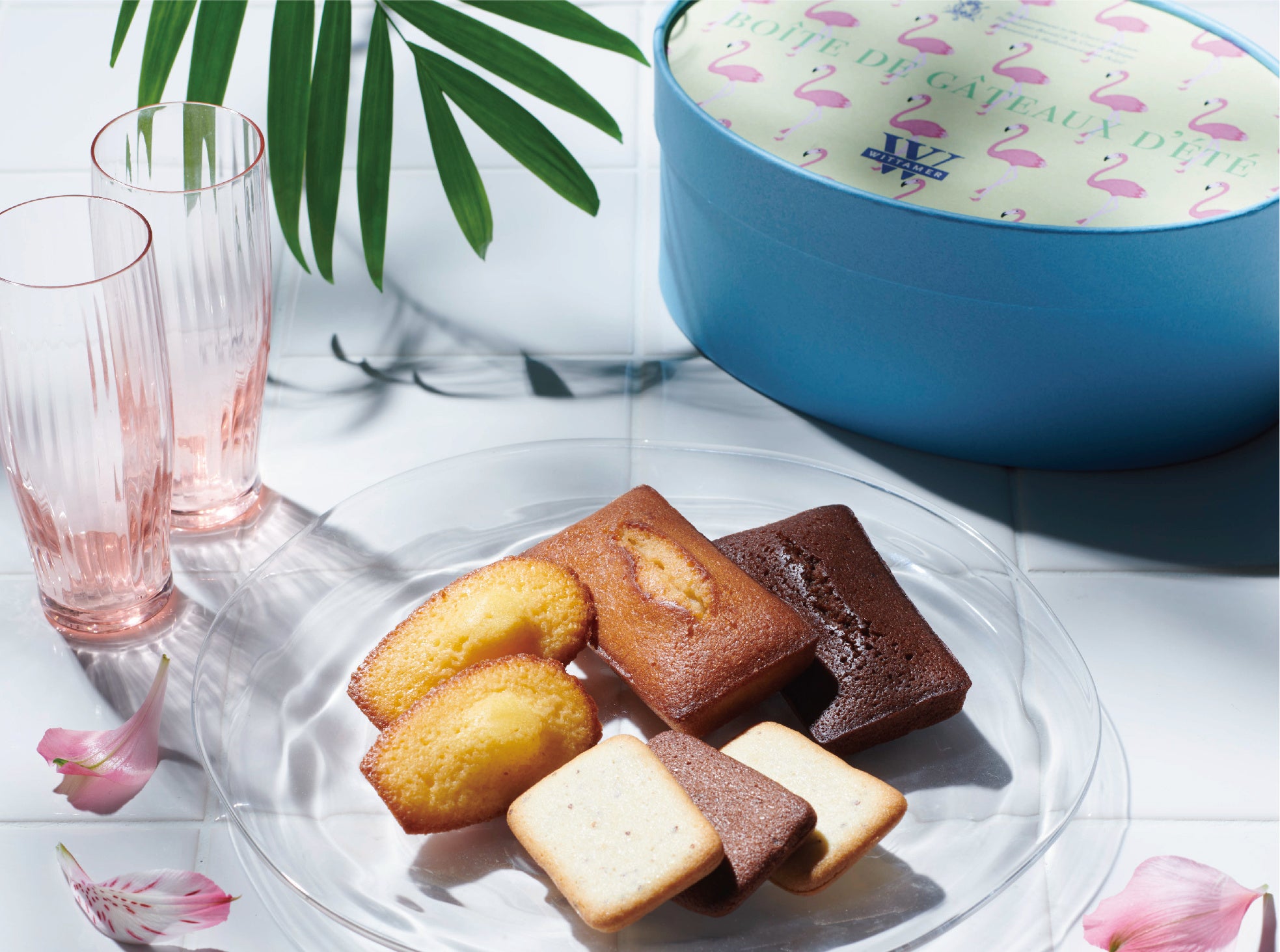 レモンの風味が爽やかな“ロイヤル・マドレーヌ(シトロン)”をはじめ、ショコラの風味が広がるサクサクの “サブレ・ショコラ”と、焦がしバターとアーモンドが香ばしい“フィナンシェ”を詰め合わせた夏のガトー BOX。フラミンゴのイラストが涼やかなブルーのパッケージでご用意しました。