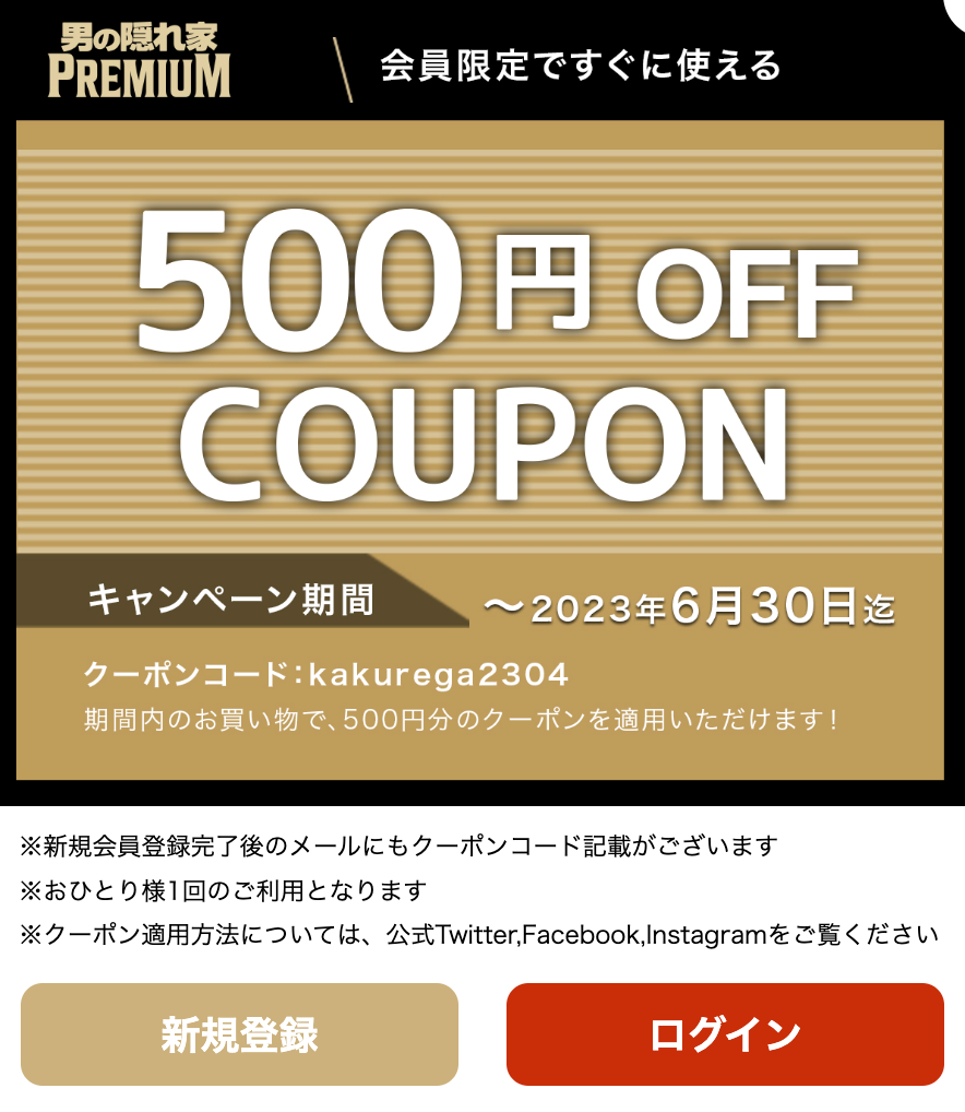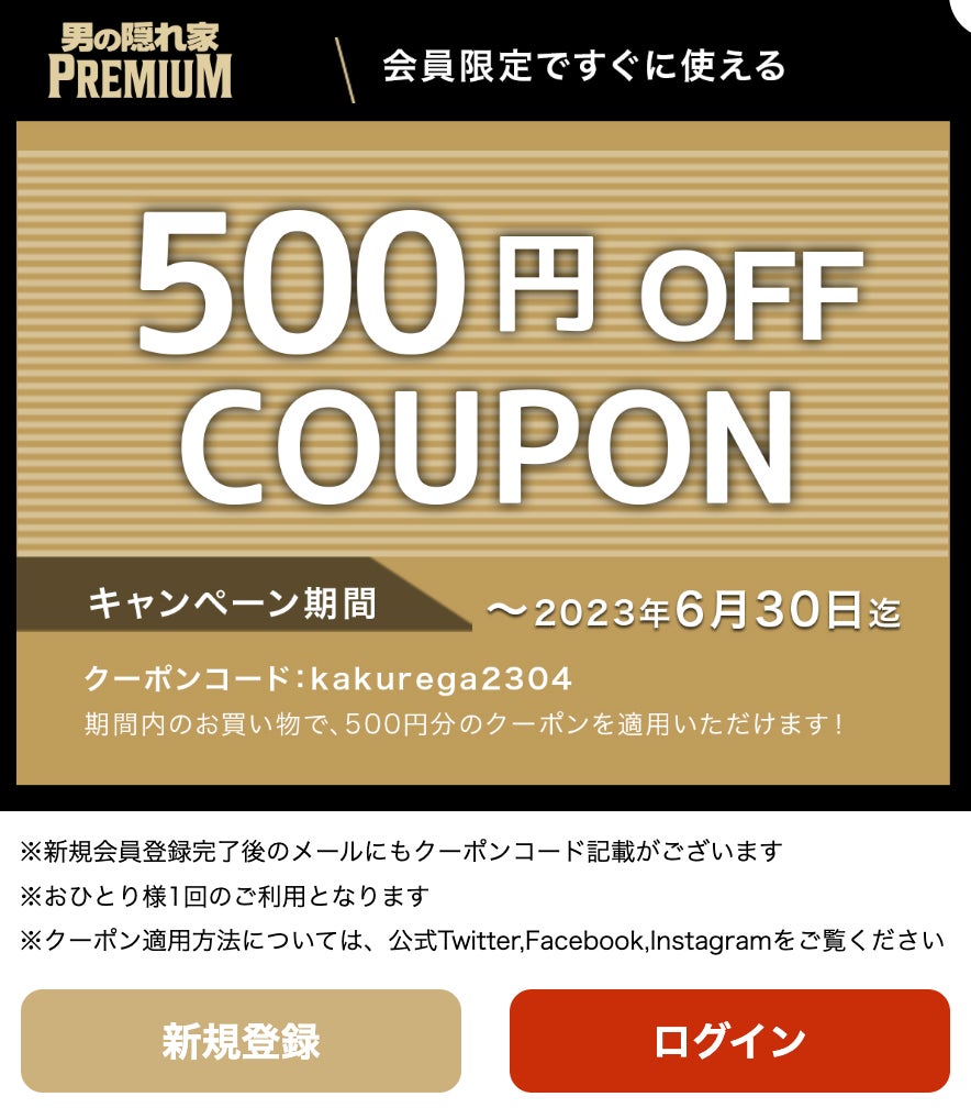 「男の隠れ家PREMIUM」サイトオープン記念として、新規登録で500円OFFクーポンプレゼント