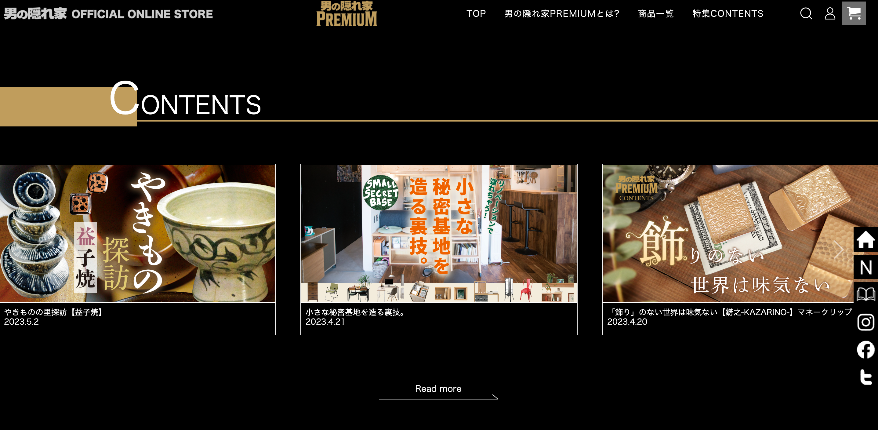 『男の隠れ家 PREMIUM』ならではのオリジナルコンテンツに加え、雑誌「男の隠れ家」関連の人気コンテンツも同時掲載することで、来訪者が楽しめるECサイトを目指していきます。