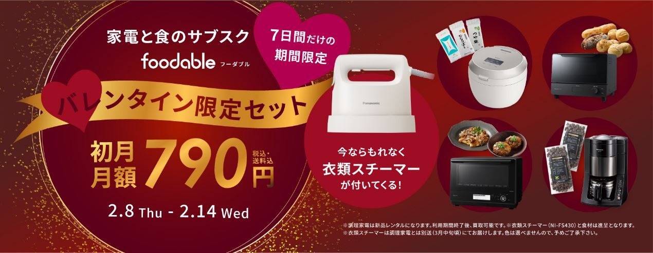 パナソニック株式会社(以下、パナソニック)は、家電と食のサブスクサービス「foodable(フーダブル)」にて、バレンタイン期間限定の特別セットを用意いたしました。調理家電、厳選食材に加え、衣類スチーマー(NI-FS430)がついた特別セットは、初月月額790円(送料込み・税込み)で販売します。