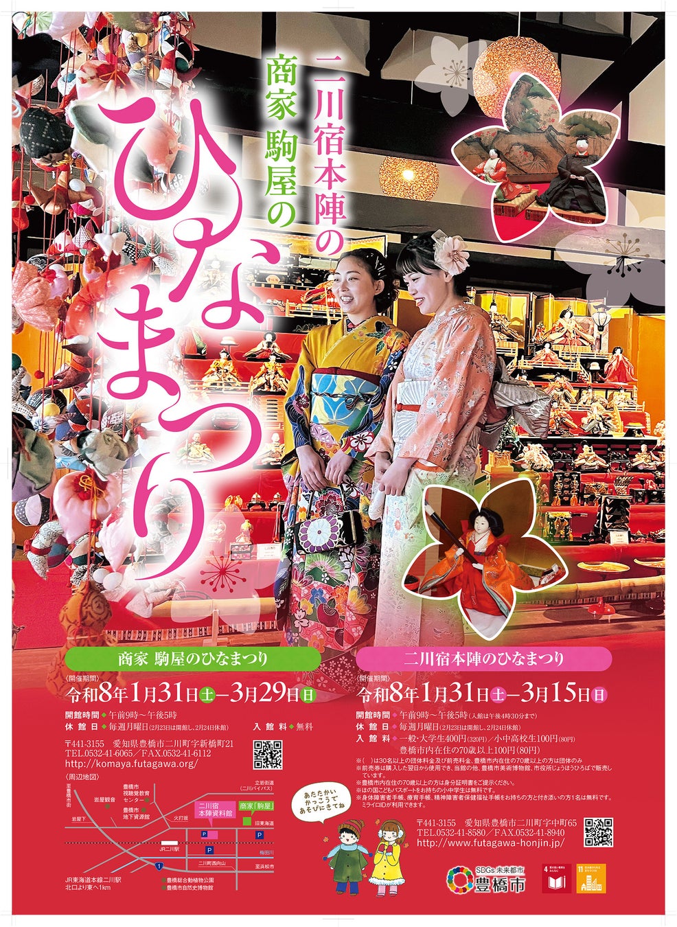 江戸時代、東海道の宿場にあり大名や公家の宿泊施設であった「二川宿本陣」と、質屋や米穀商を営んでいた由緒ある商家「駒屋」。豊橋市に残る、江戸時代の情緒を感じられる歴史的な場所で、今年も「ひなまつり」がスタートします!
