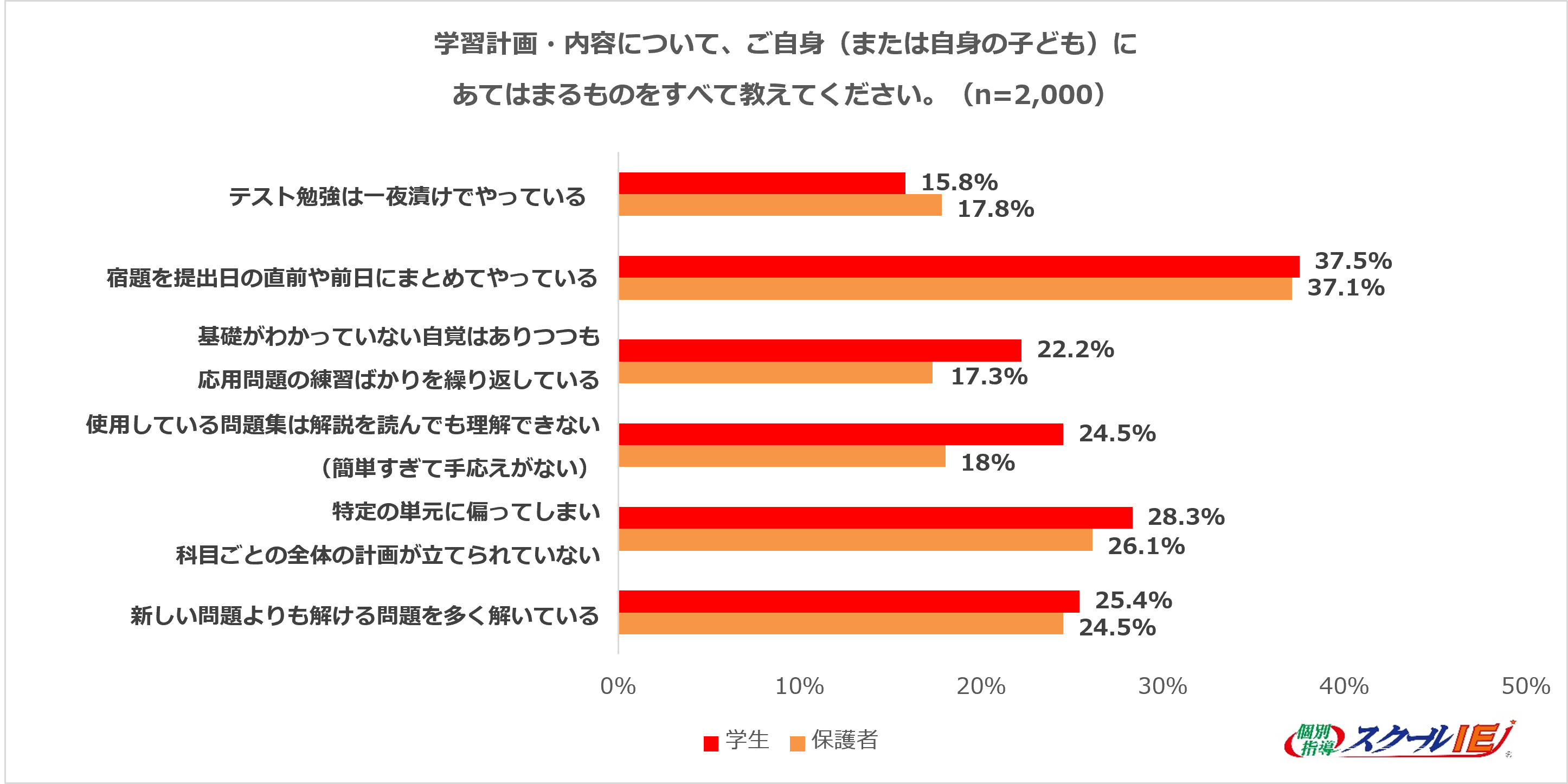高校生の25.0%が「テスト勉強を一夜漬けでやっている」と回答した他、「宿題を提出直前にまとめてやる」は学生37.5%、保護者37.1%と「短期まとめ型学習」となりやすい傾向が明らかに。 -