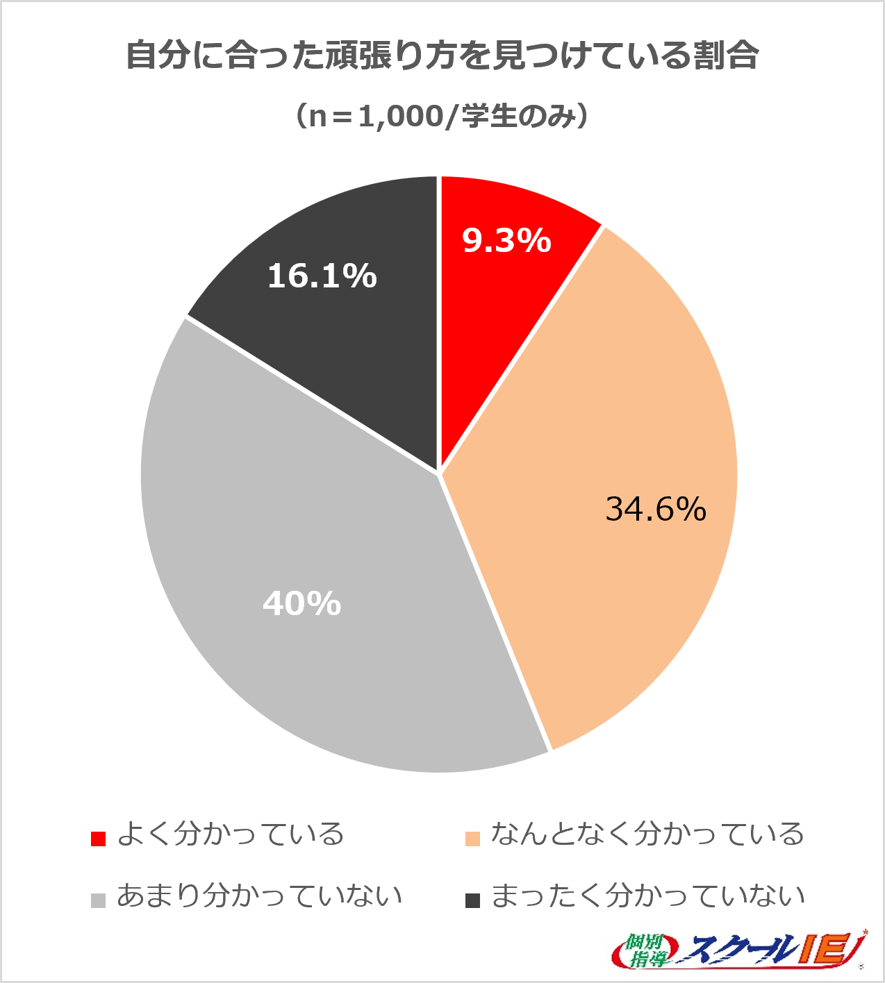 学生・保護者を対象に、「自分(または自身の子ども)に合った成果につながる努力の仕方(勉強のやり方)をわかっているか」を聞いたところ、全体の約6割が「分かっていない」と回答しました。内訳を見ると、「まったく分からない」と答えた人は学生16.1%、保護者16.5%、「あまり分かっていない」は学生40.0%、保護者44.4%にのぼり、多くの家庭で頑張り方が分からないまま努力をしている実態が浮き彫りになりました。