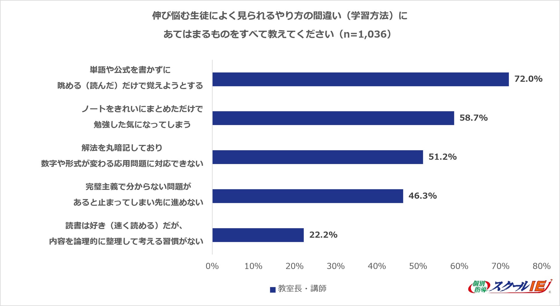 一方で、スクールIEの教室長・講師に対し、「成績が伸び悩む生徒によく見られる学習方法」を聞いたところ、「単語や公式はノートに書かず、見て(読んで)覚える(72.0%)」が最も多く、学生・家庭では気づきにくい、努力のつまずきポイントとして認識されていることが分かりました。他にも「ノートをきれいにまとめただけで勉強した気になってしまう(58.7%)」、「解答を丸暗記しており、数字や形式が変わる応用問題に対応できない(51.2%)」があげられました。