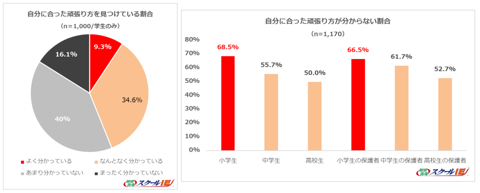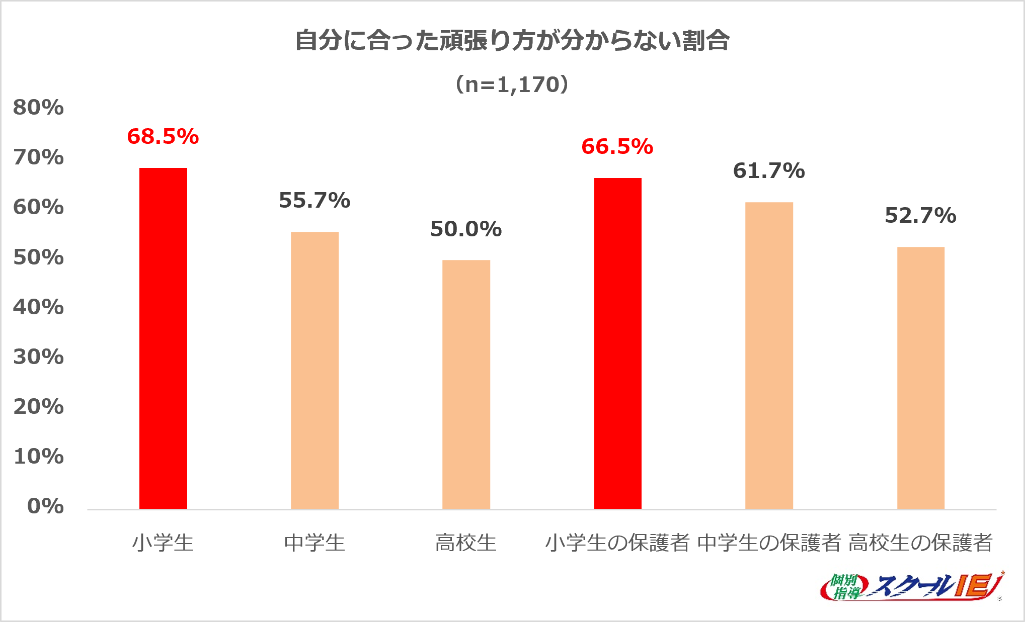 学年別に見ると、低学年ほど顕著な傾向となり、小学生では学生68.5%、保護者66.5%が「自分に合う努力の仕方が分かっていない」と回答。中学生(学生55.7%、保護者61.7%)、高校生(学生50.0%、保護者52.7%)と学年が上がるにつれて割合は減少するものの、半数以上が自分に合う努力の仕方が見つけられていない“努力迷子”であることがうかがえます。