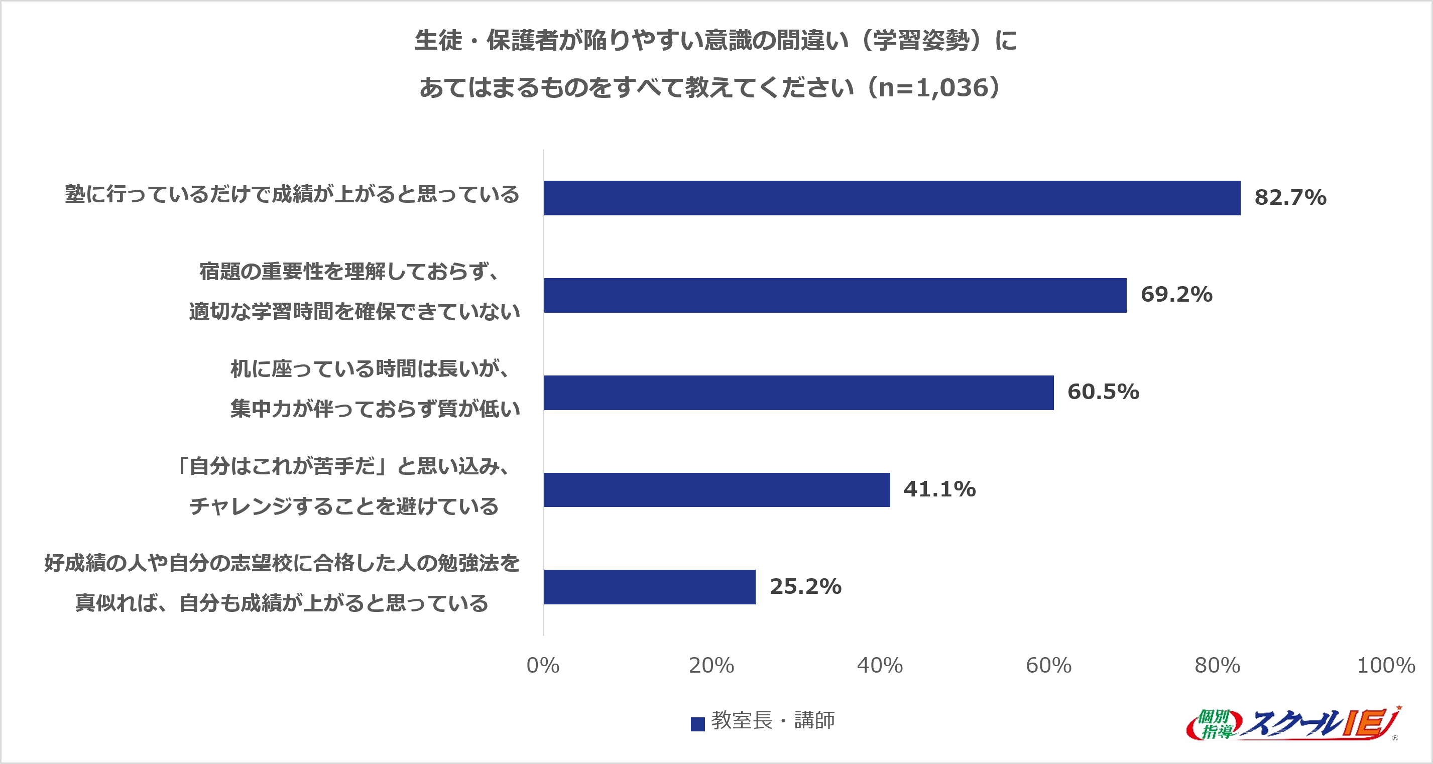 一方で、スクールIEの教室長・講師に「生徒・保護者が陥りやすい学習姿勢」を聞いたところ、最多は「塾に通っていれば、成績が上がると思っている」で82.7%という結果に。これに対し、学生・保護者側の回答は、学生21.9%、保護者16.9%にとどまり、教育現場の認識と家庭の間に約4倍のギャップがあることが分かりました。また、この大きな認識差は、成績向上には通塾だけでなく、学校の授業や家庭学習を含めた学習に向き合う姿勢そのものが重要であるという認識が、まだ家庭内では十分に浸透していない実態を物語っています。塾で得た解法や自分に合った勉強法を、いかに日々の習慣に落とし込み、主体的に動けるか。通塾を単なる受講で終わらせず、生活全体の学習サイクルを最適化する起点にすることが、成果を最大化させる鍵となります。