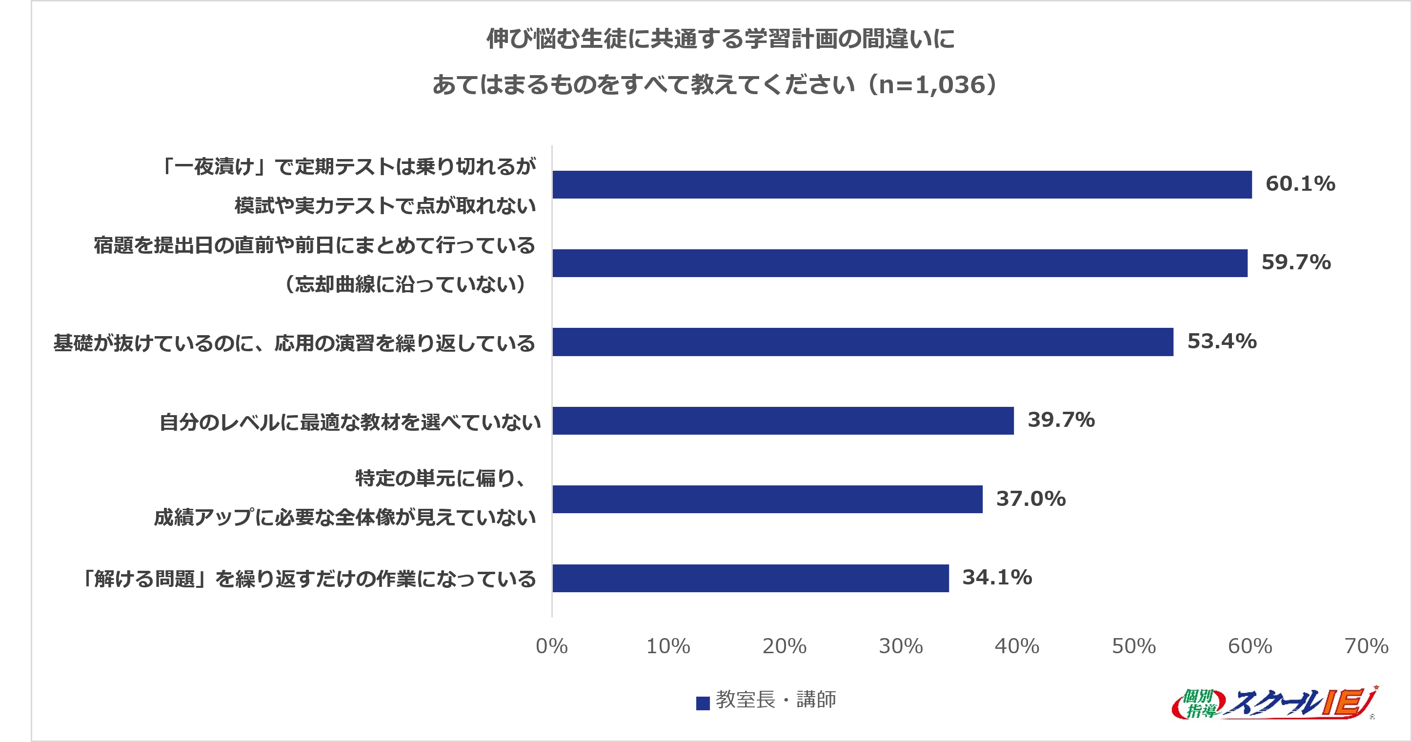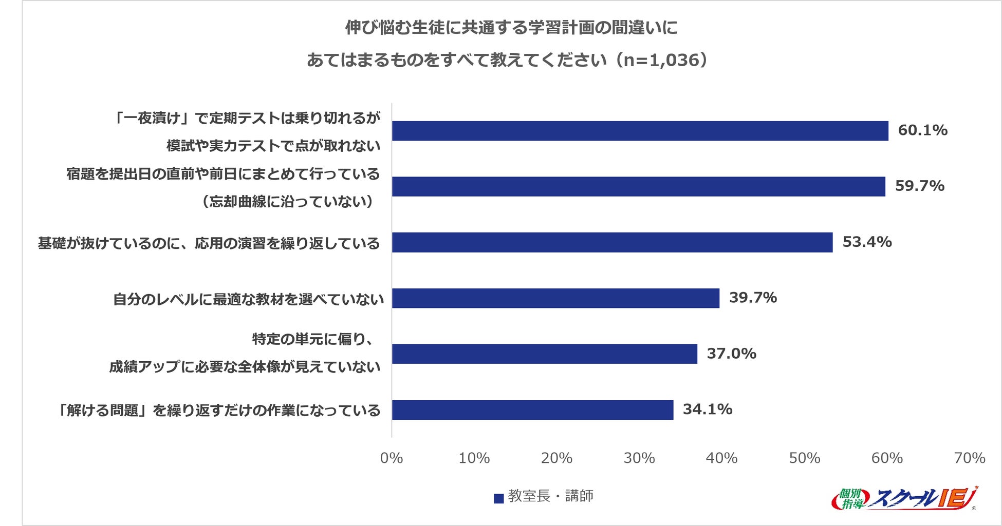 成績が伸び悩む生徒に多い学習計画について、スクールIEの教室長・講師に聞いたところ、最も多かったのは「『一夜漬け』で定期テストは乗り切れるが、模試や実力テストで点が取れない」で60.1%にのぼりました。