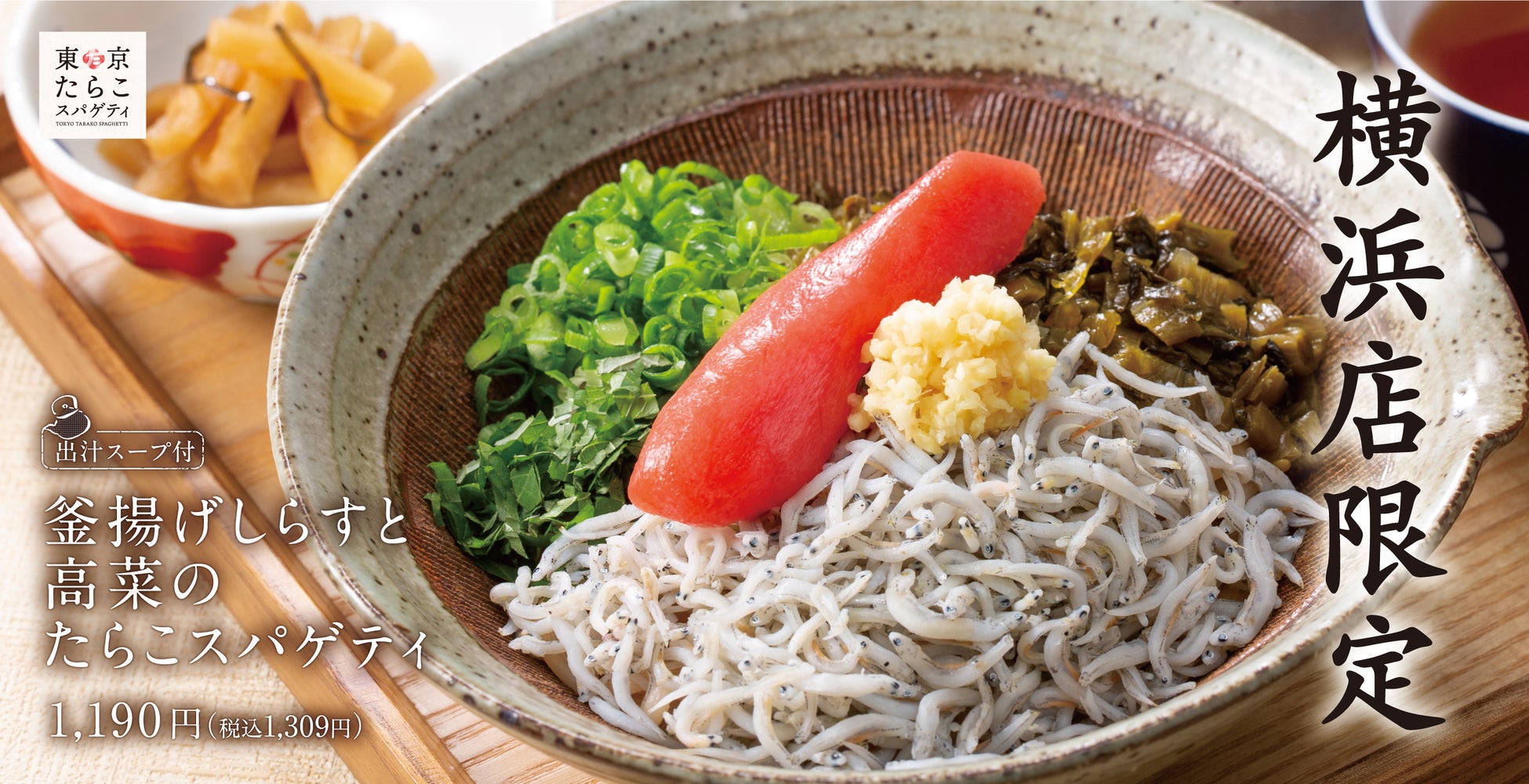 ここでしか食べられない進化系たらこスパゲティとして2023年11月1日(水)より横浜店かつ期間限定で「釜揚げしらすと高菜のたらこスパゲティ」を販売開始いたします。