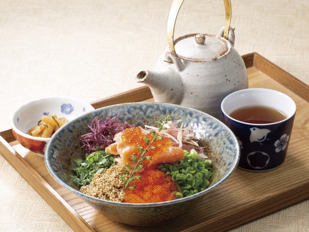 しっとりと濃厚な塩麴漬けサーモンと見た目に華やかないくら、本メニュー限定の薬味として"ふのり"をトッピングした、今しか食べられないお出汁スパゲティに仕立てました。