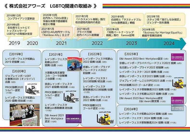 アドベンチャーワールド(和歌山県白浜町)は、大阪で開催される「レインボーフェスタ!2024」および那智勝浦で開催される「レインボーフェスタ那智勝浦2024」に協賛およびブース出展いたします。性的マイノリティに関する社会課題の認知拡大を目指す本活動を通して、LGBTQに対する社会的認知を多くの方に身近に深めて頂くと共に、この問題にひとりで苦しんでいる人たちに手を差し伸べる機会になると考えております。アドベンチャーワールドを運営する株式会社アワーズでは、社内同性パートナーシップ規程の施行や、身だしなみ規定のジェンダー別撤廃、社内講演など、働きやすい環境の整備に取り組んでいます。今後も、様々なイベントに参加、働き方の見直しを行い、スタッフ全員がLGBTQに関する理解を深め、誰もが楽しめるパークを目指していきます。